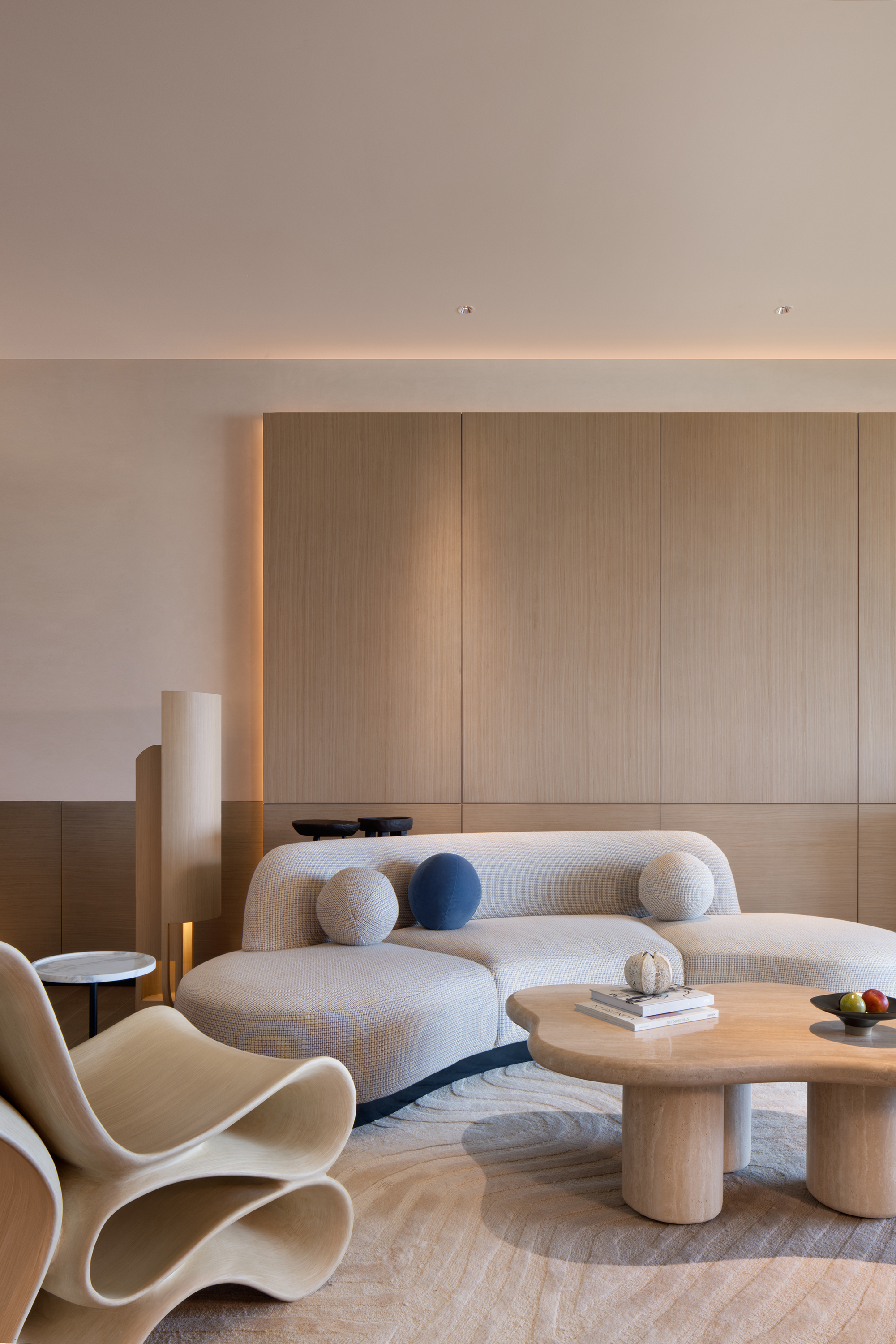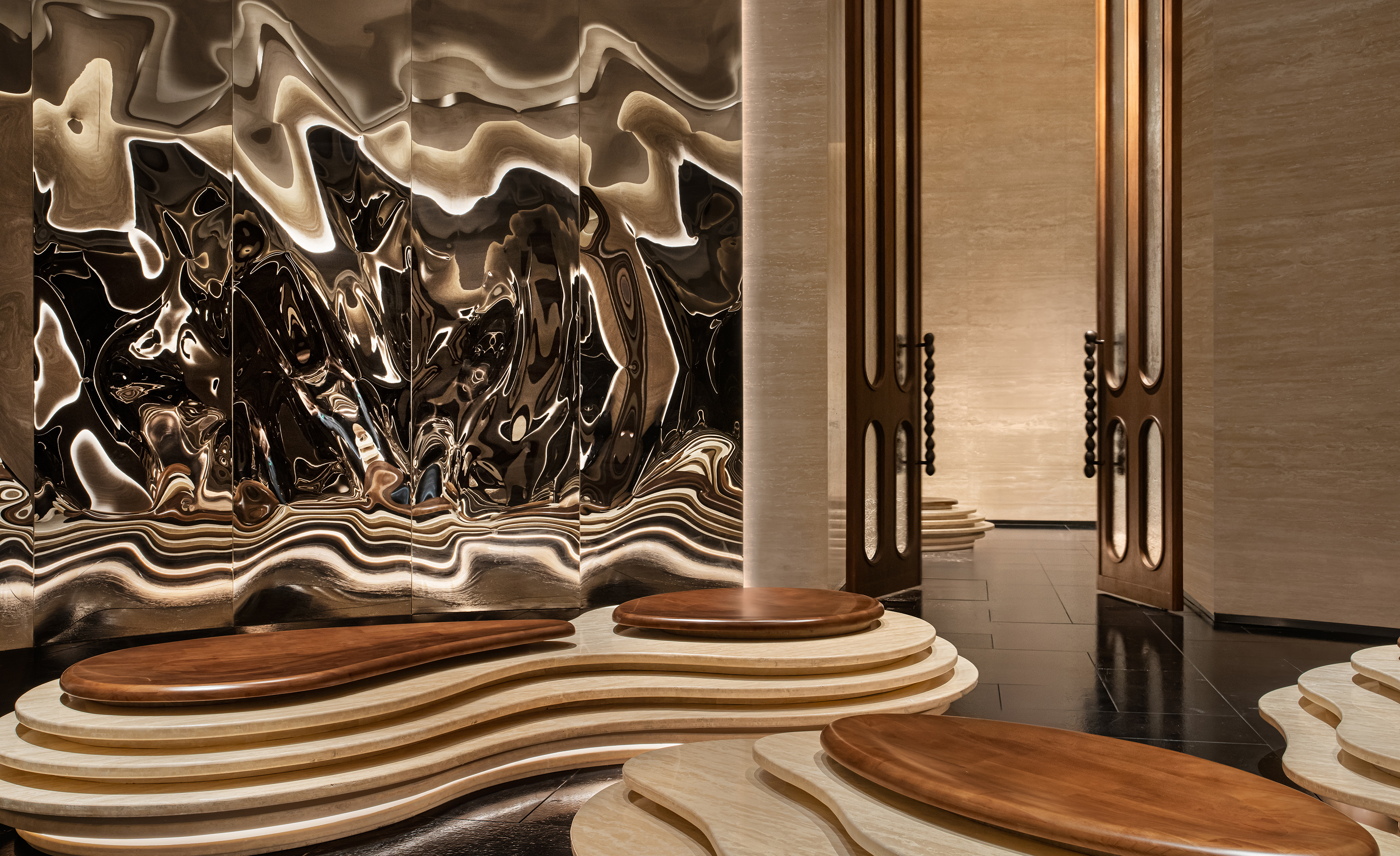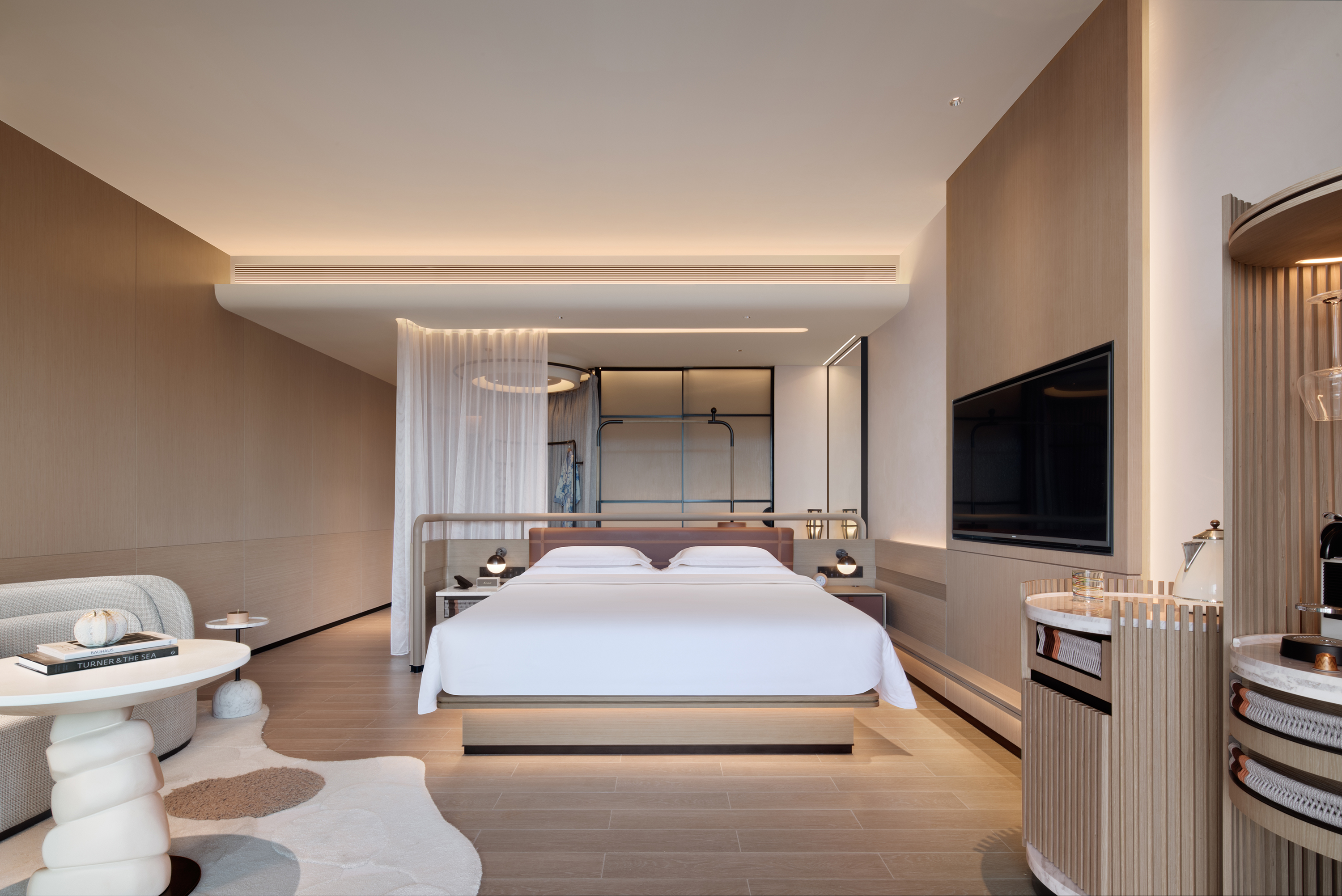邻间餐厅外引入380平的无边际水景,将景观面拓展至65米。客房设计独具一格,斜向布局拓展了阳台景观面。衣帽空间以半开放式圆形设计,巧妙隔开床与卫浴