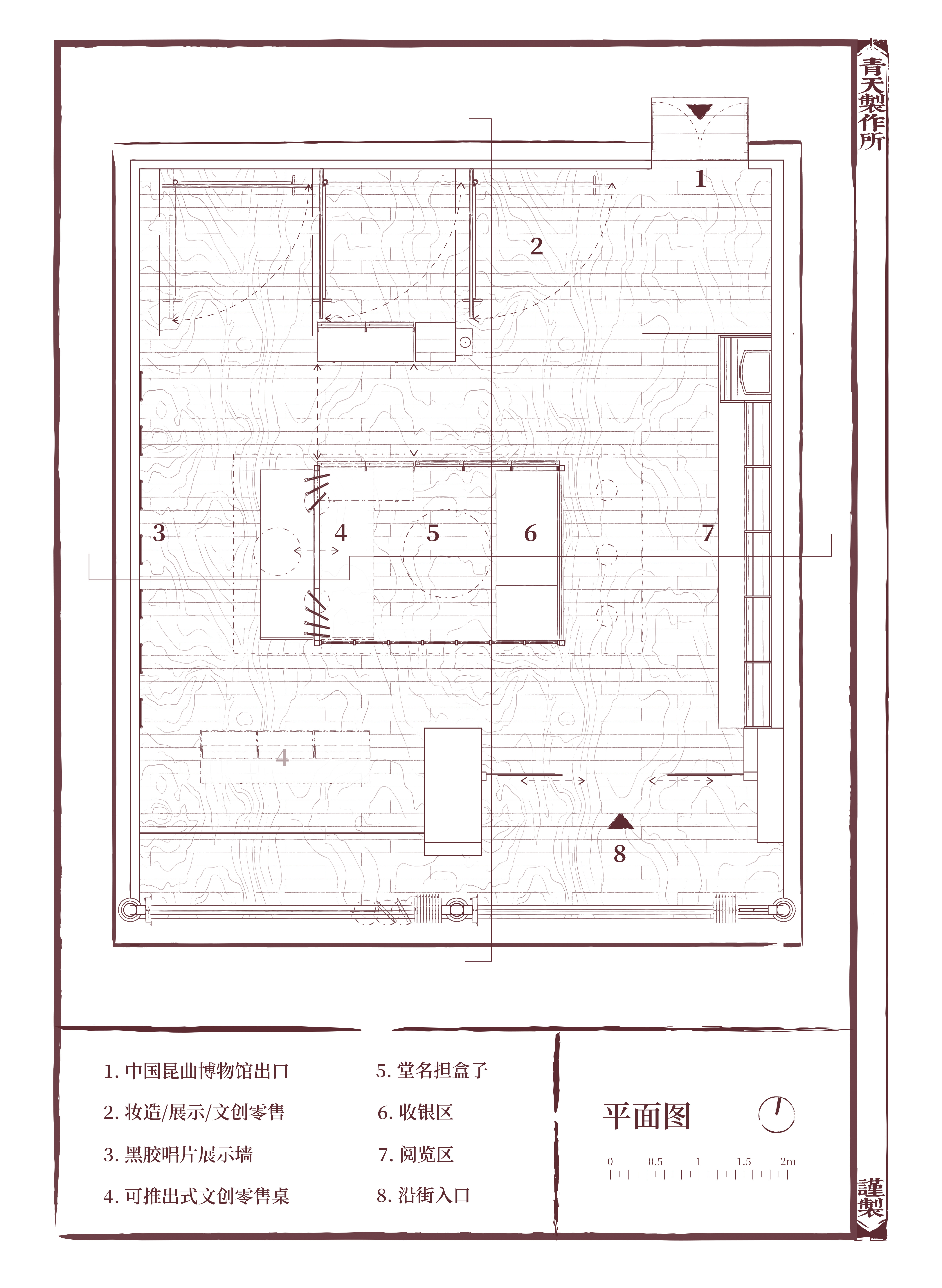 设计灵感源自昆曲传统便携戏台“堂名担”,将其轻巧、可拆合、可移动演出的舞台机制转译为中心装置——一个不足 7 平方米的嵌入式微型剧场。结合可移动展陈、模块化导视与伸缩帷幕,空间可在书店、剧场、展览与社区活动等多种功能间自由切换。