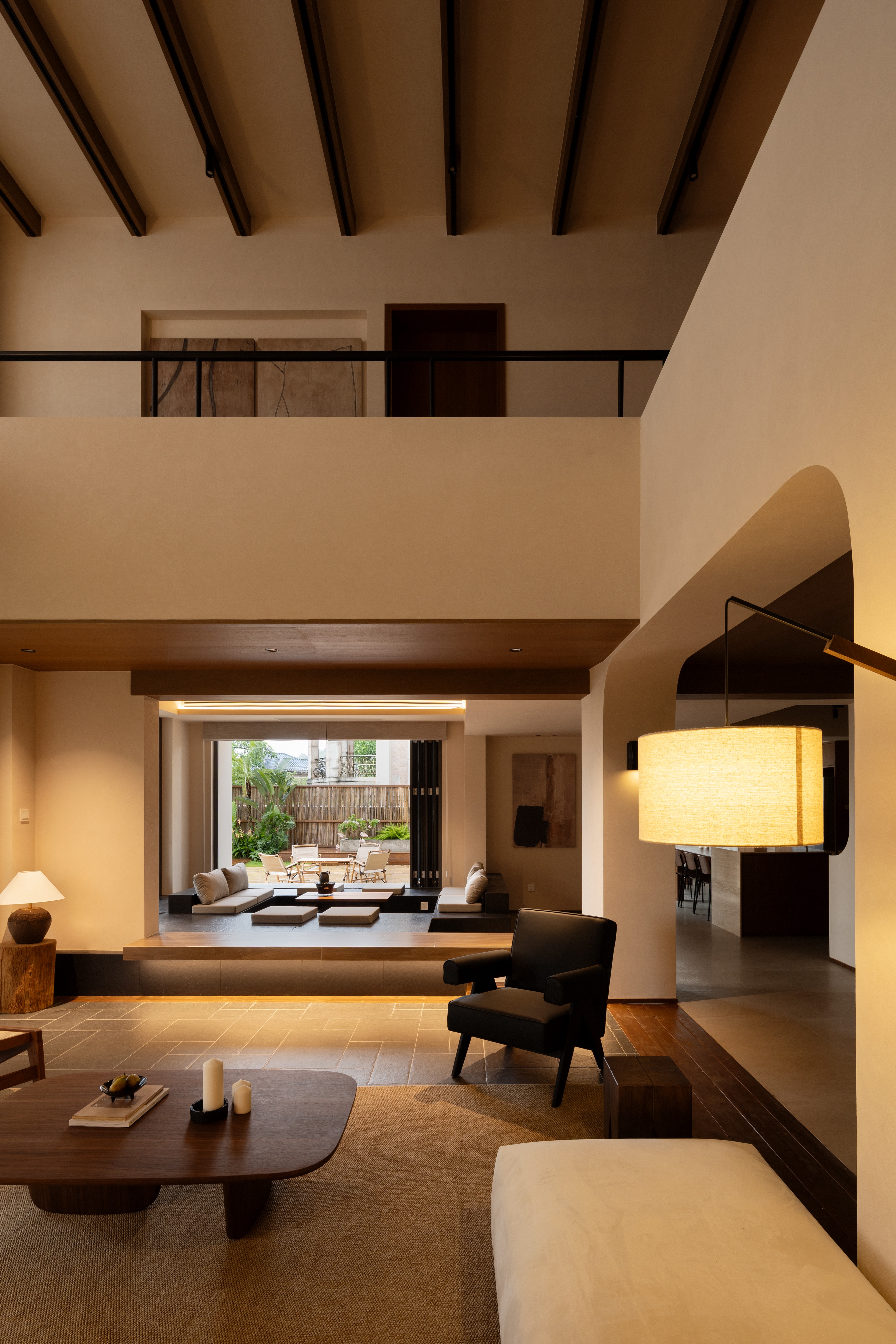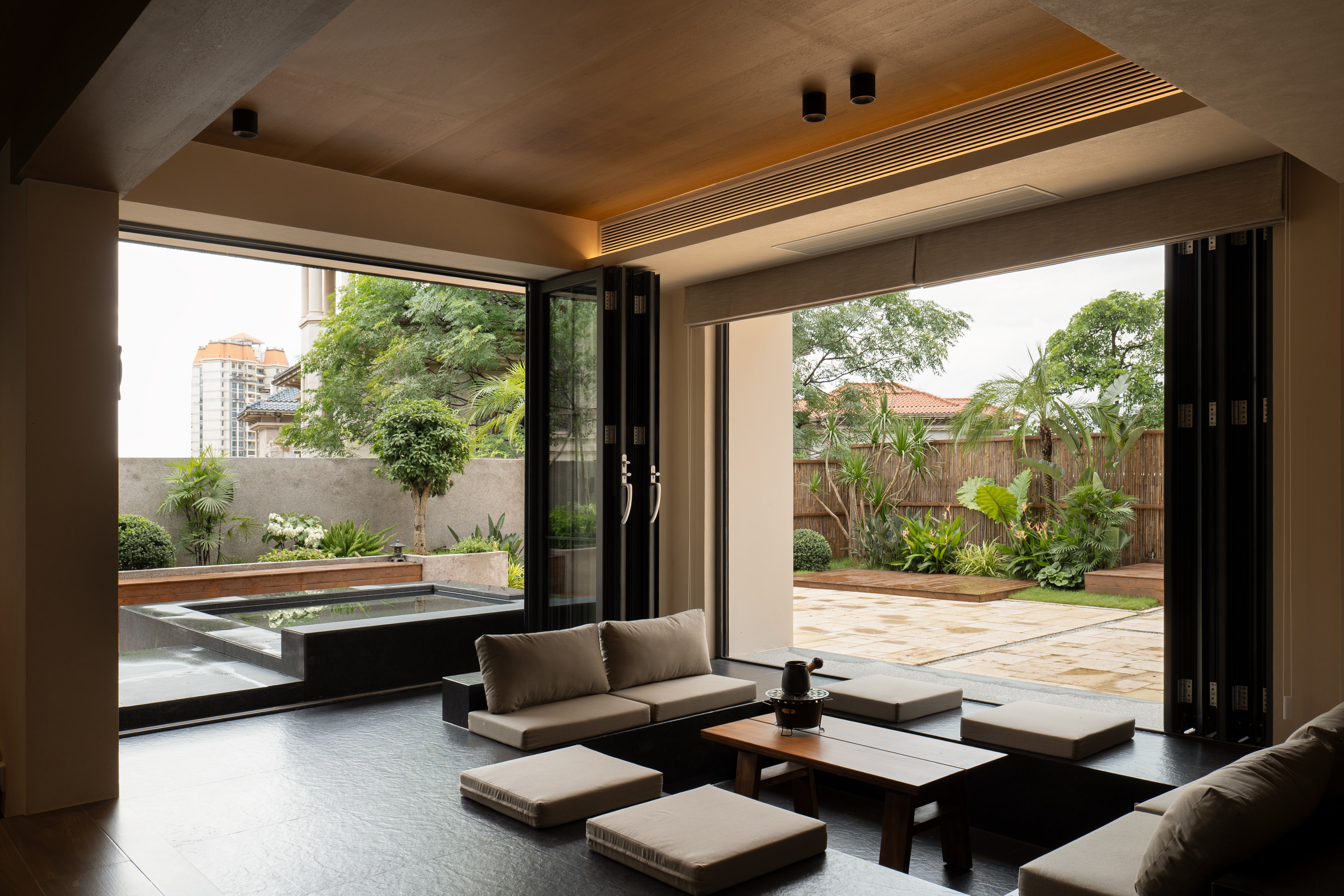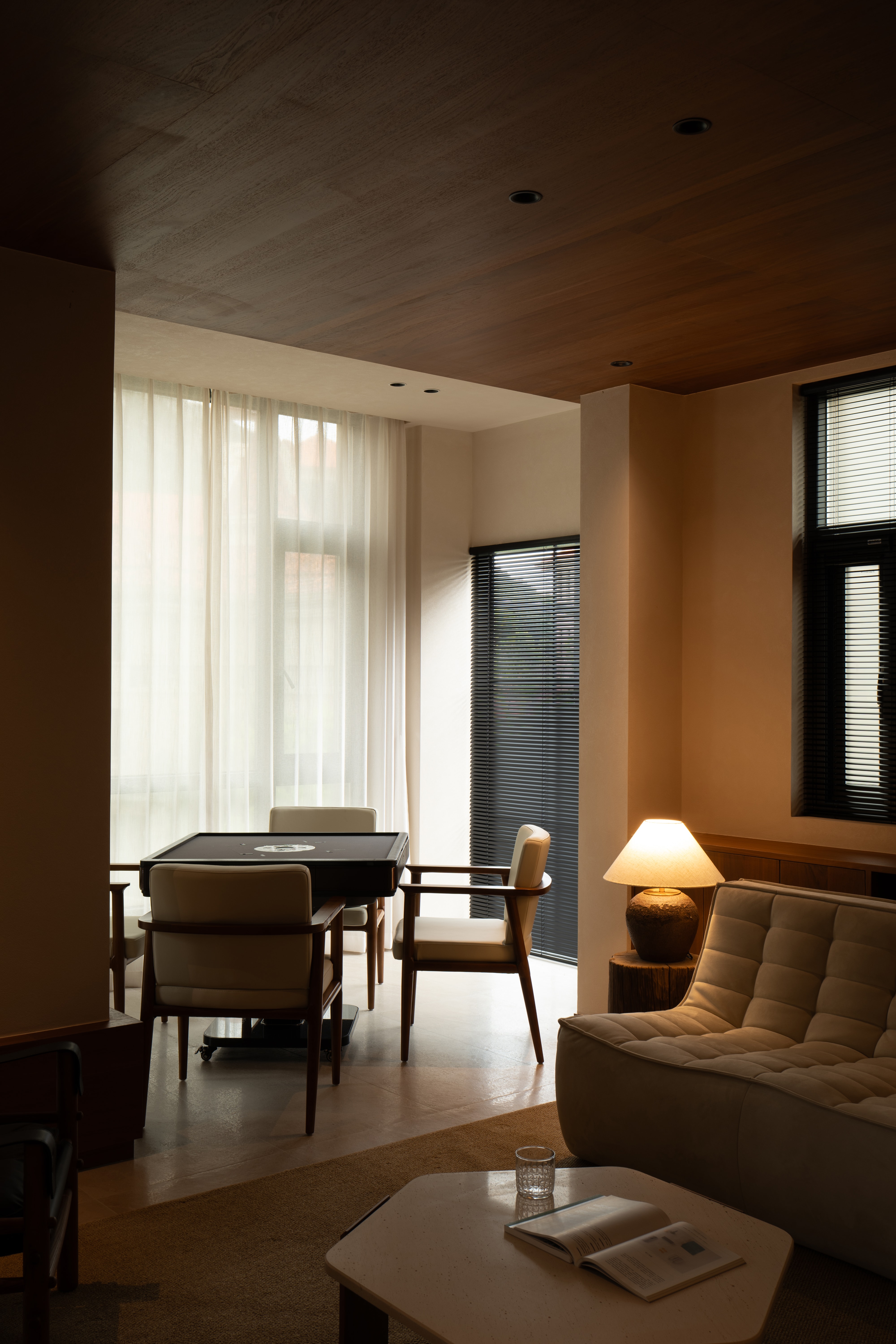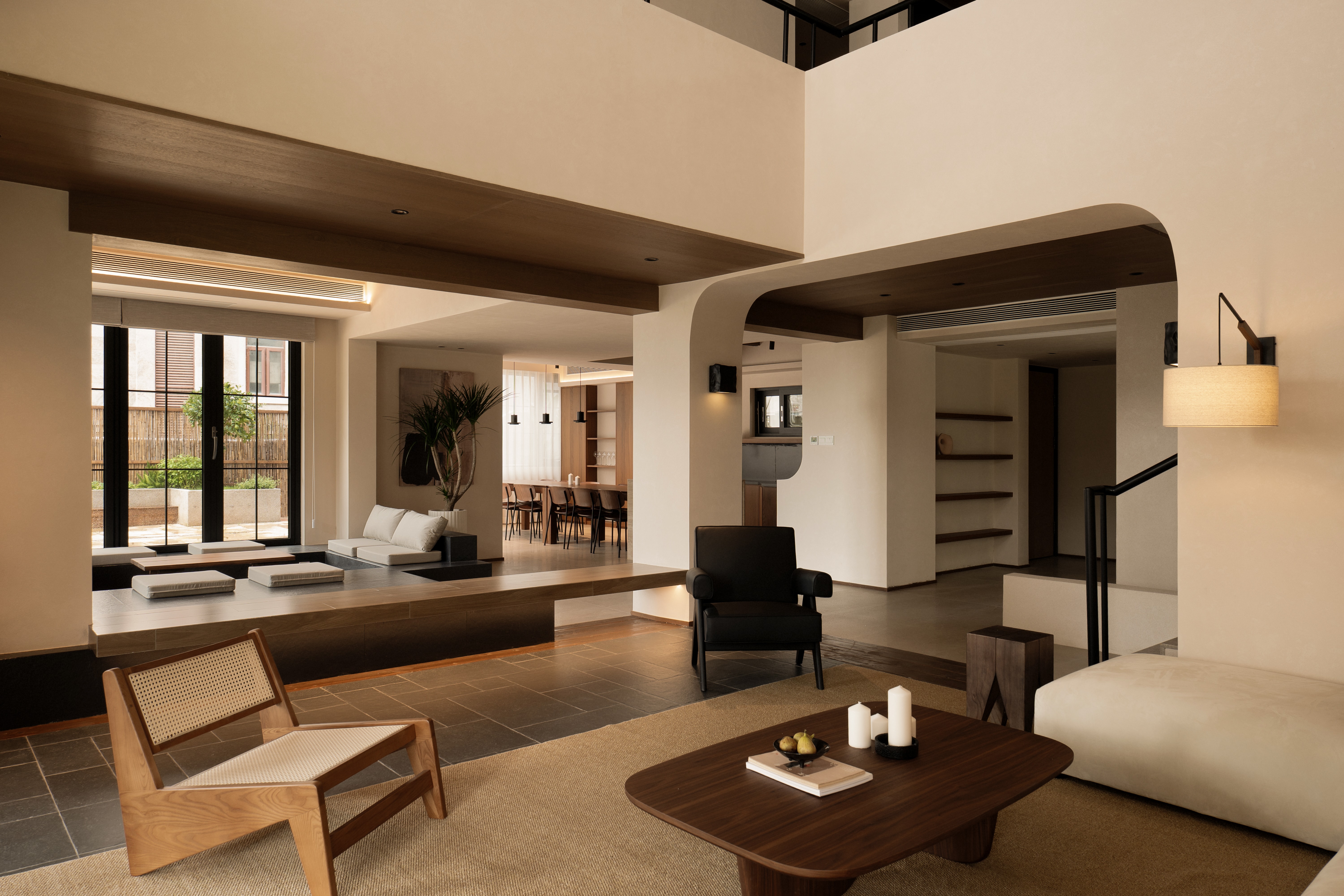This suburban hot spring villa is a family retreat designed to strengthen bonds through nature and shared interaction. The design prioritizes freedom, ease, and connectivity. A double-height living room erases interior and exterior boundaries, while encouraging visual exchange between floors. An adjacent sunken tea area opens to the hot spring and garden, offering individual retreat without isolation. Intimate lounges on the first and second floors provide gathering spaces, and top-floor bedrooms include child-friendly lofts. The varied areas accommodate engagement with nature, social connection, or solitude. Natural materials and layered views compose a tranquil escape from urban routine.