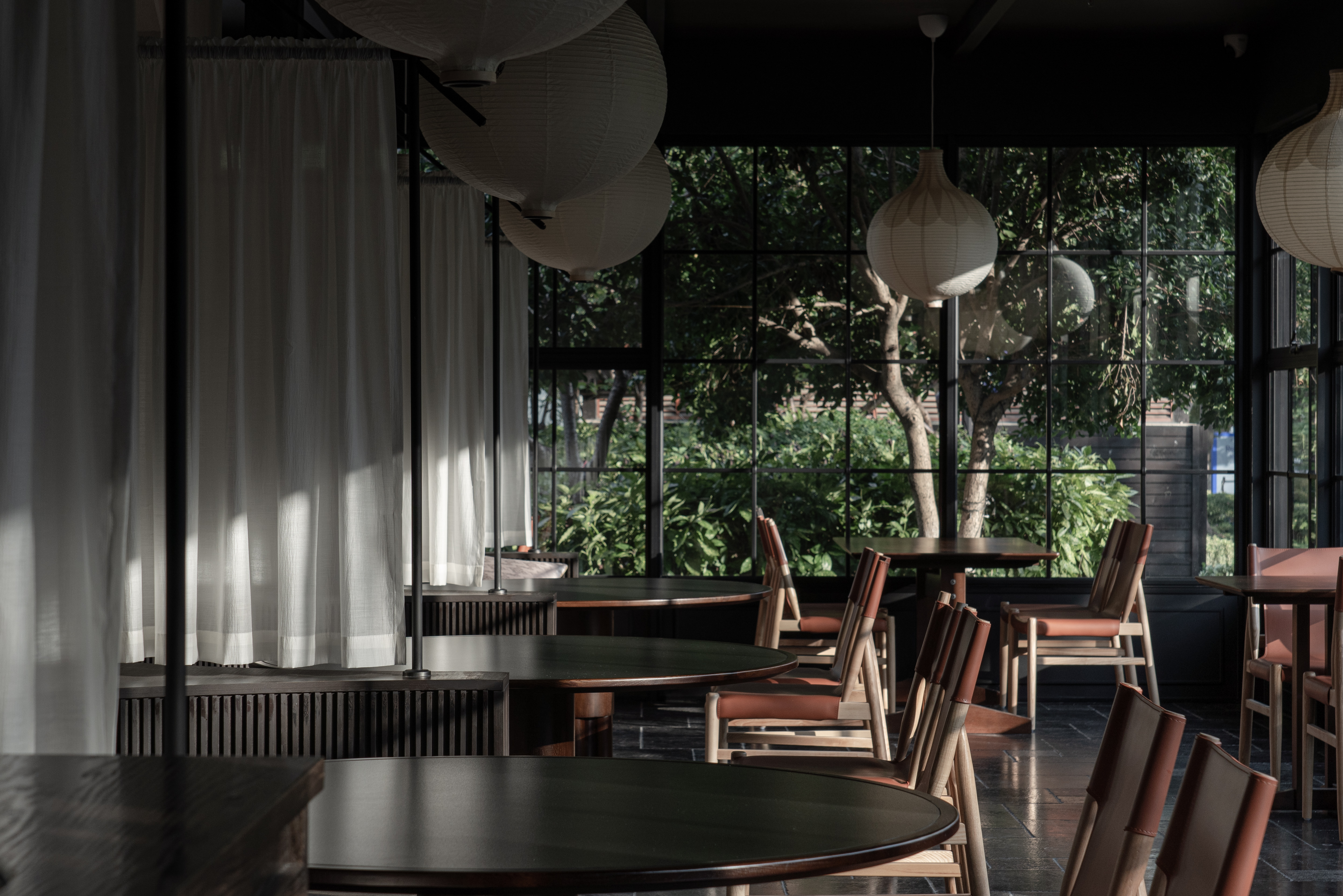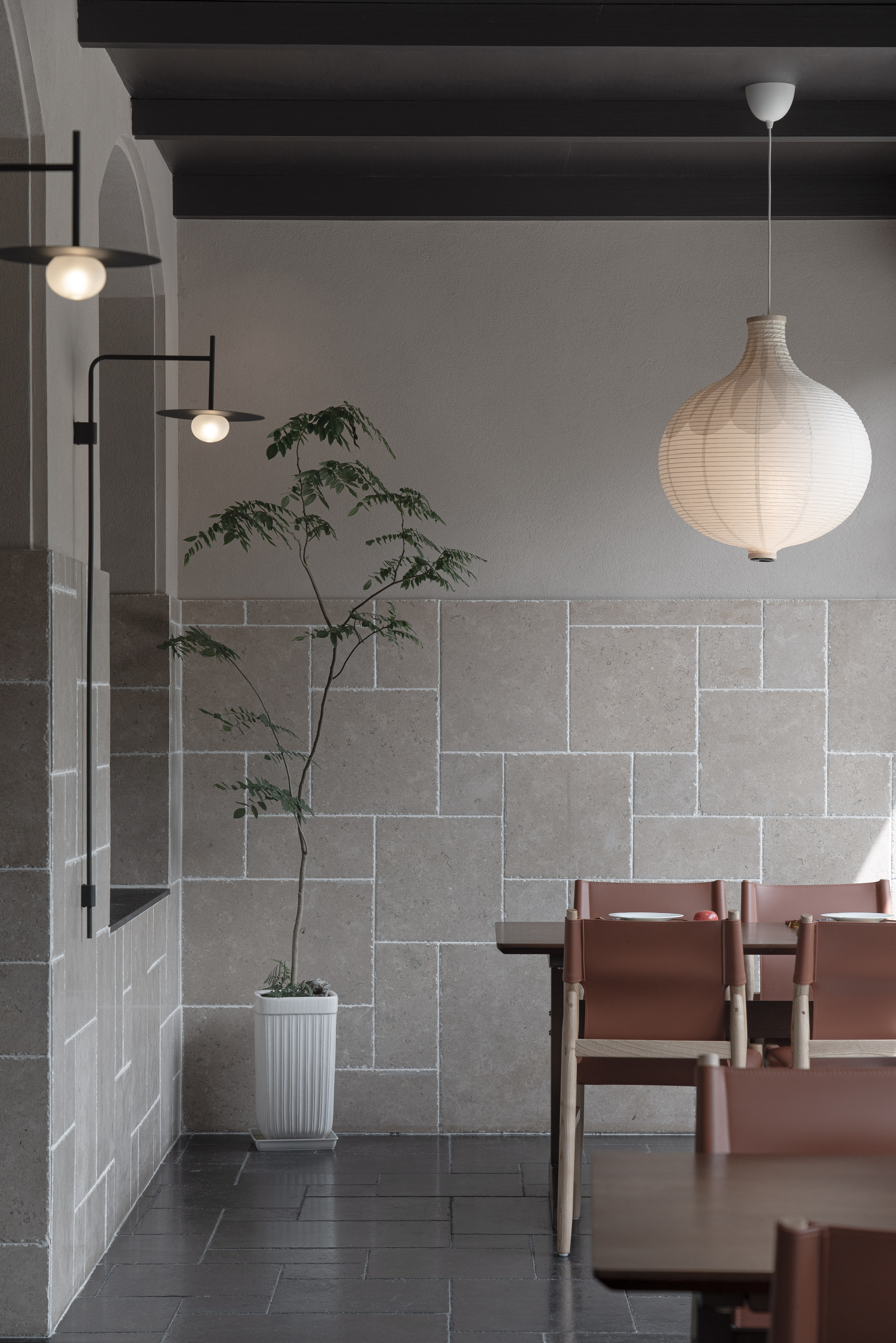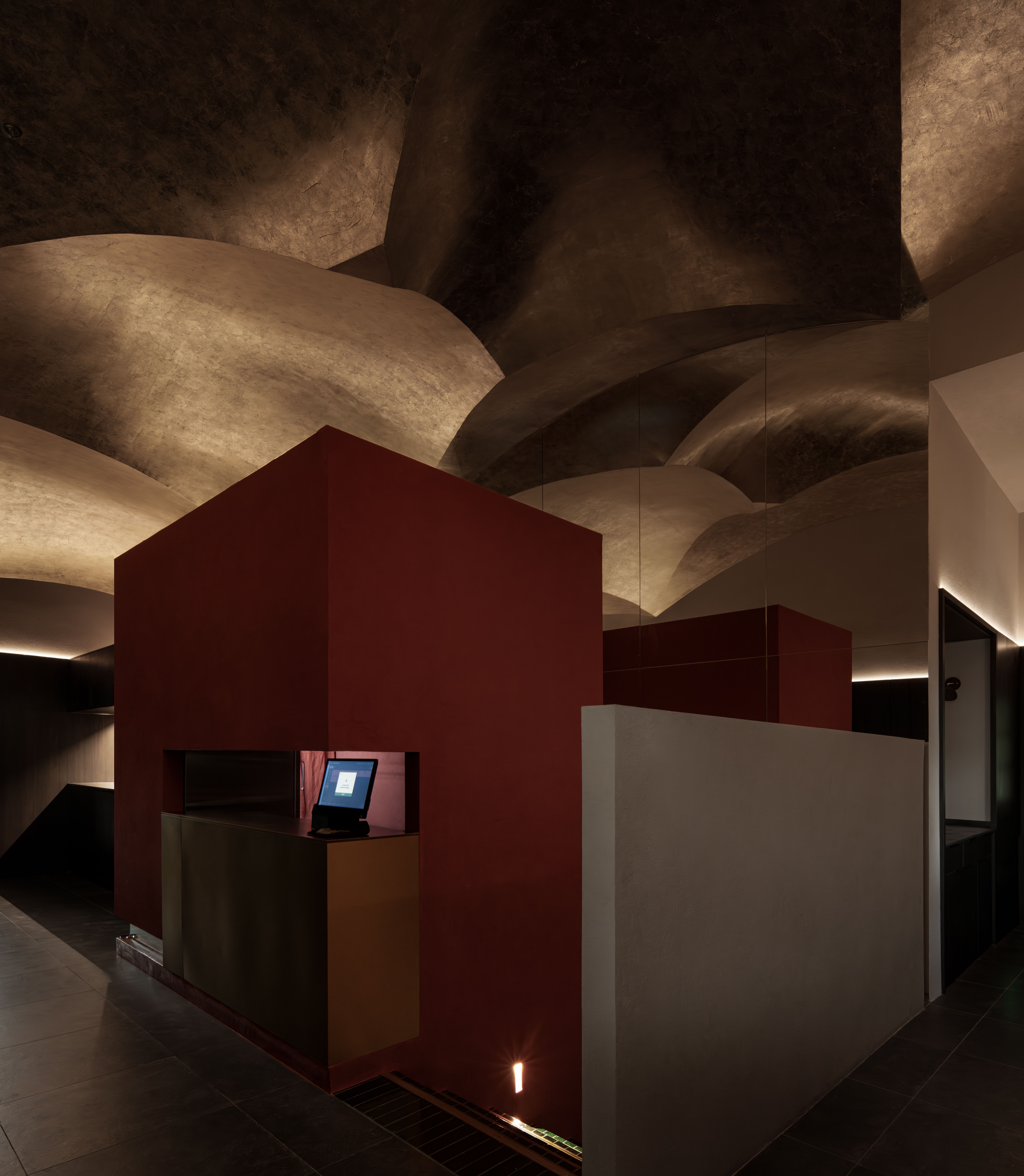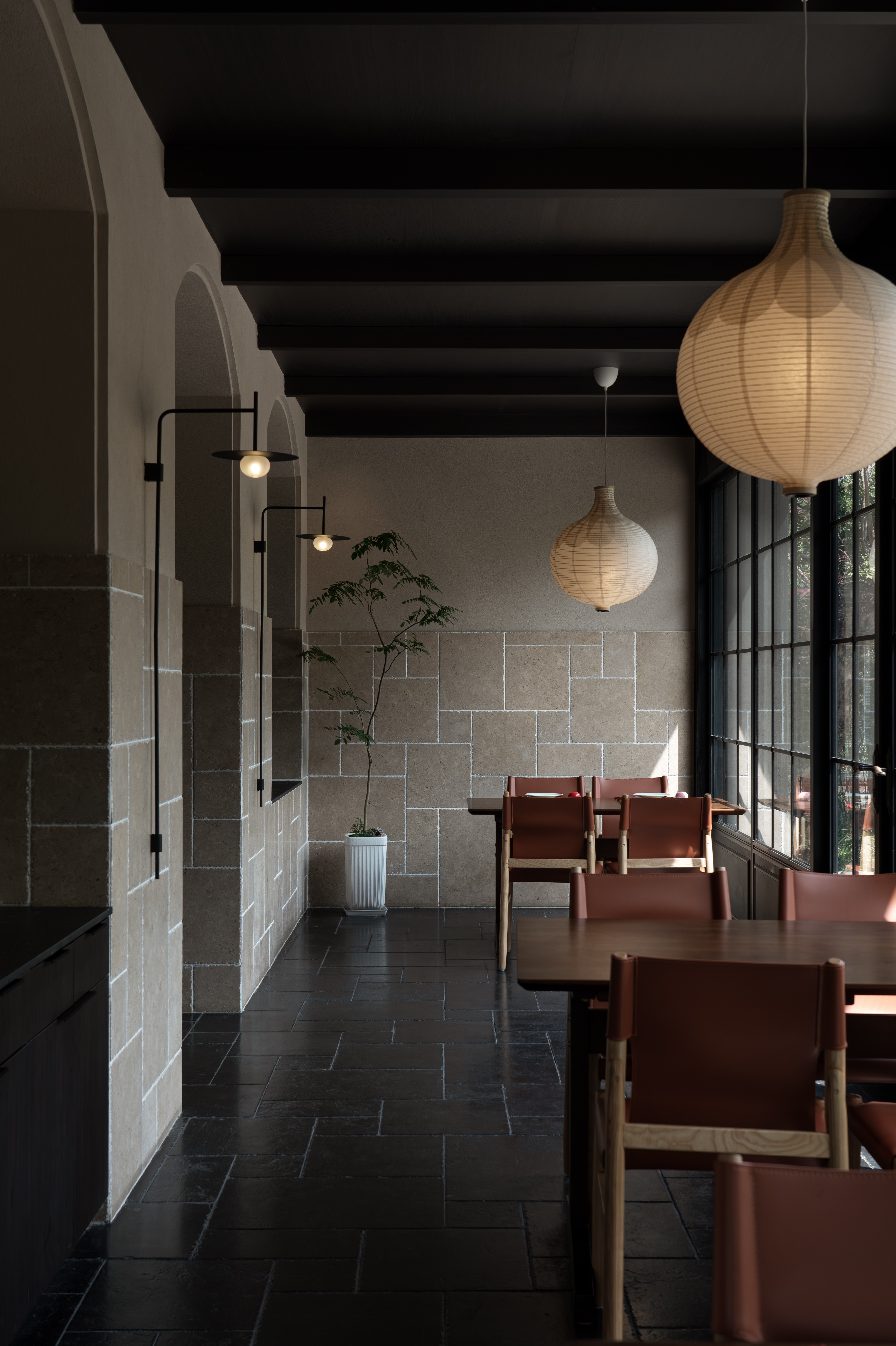 建筑元素中常见的拱形元素被应用于前厅隔断结构中的拱形开窗中,室外盎然的自然景色也被界定为一幅框景。食客在此用餐,更能感受不同于日常生活情境中的仪式感。深色系的地砖、浅色系的墙砖与红色系中台形成材料颜色的对比。随着不同的线条、光影、材质的组合,我们精心“编奏”的空间序幕缓缓展开,公共座位区穿插着设计的纸灯,也为访客带来手工艺的温暖气息。