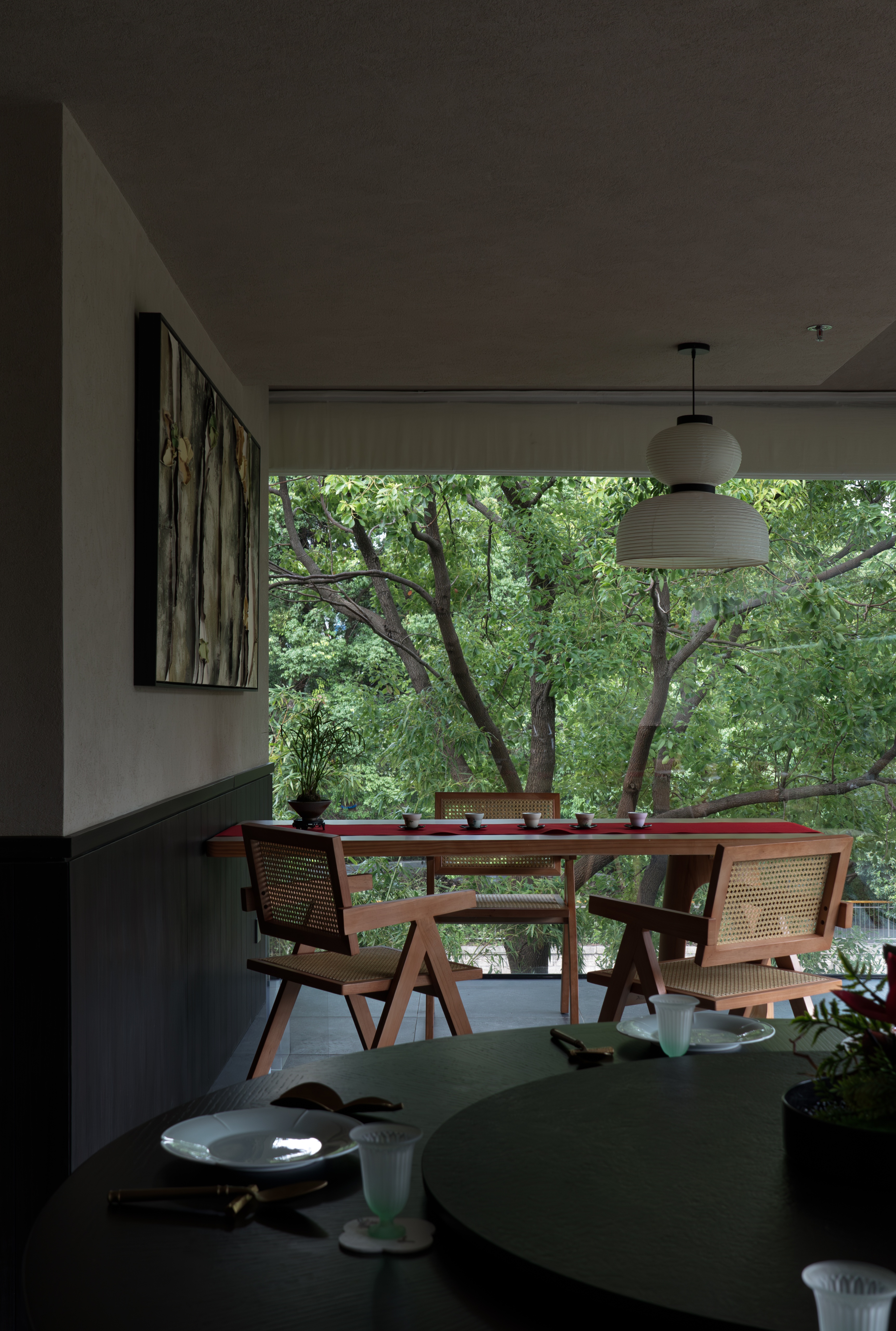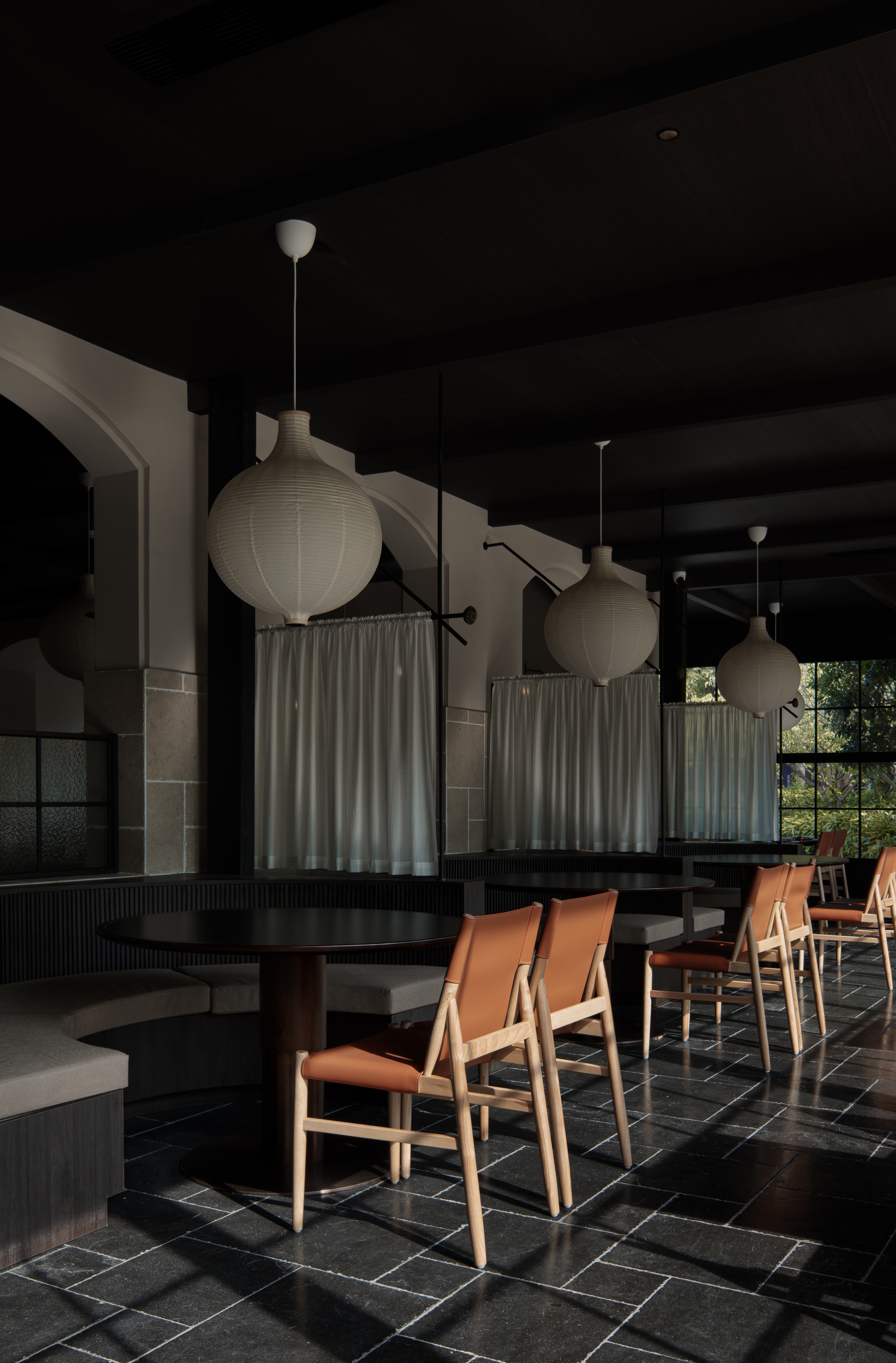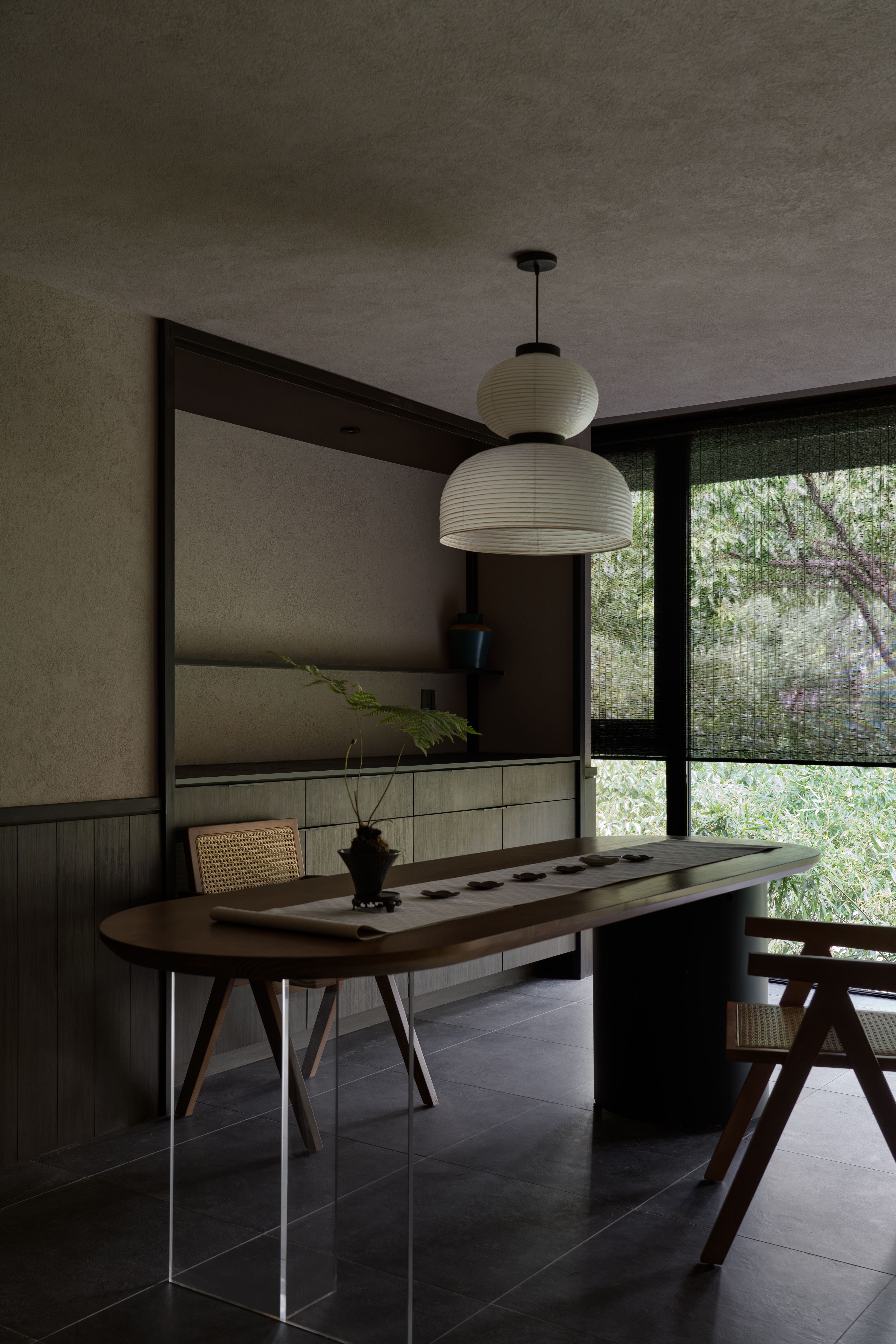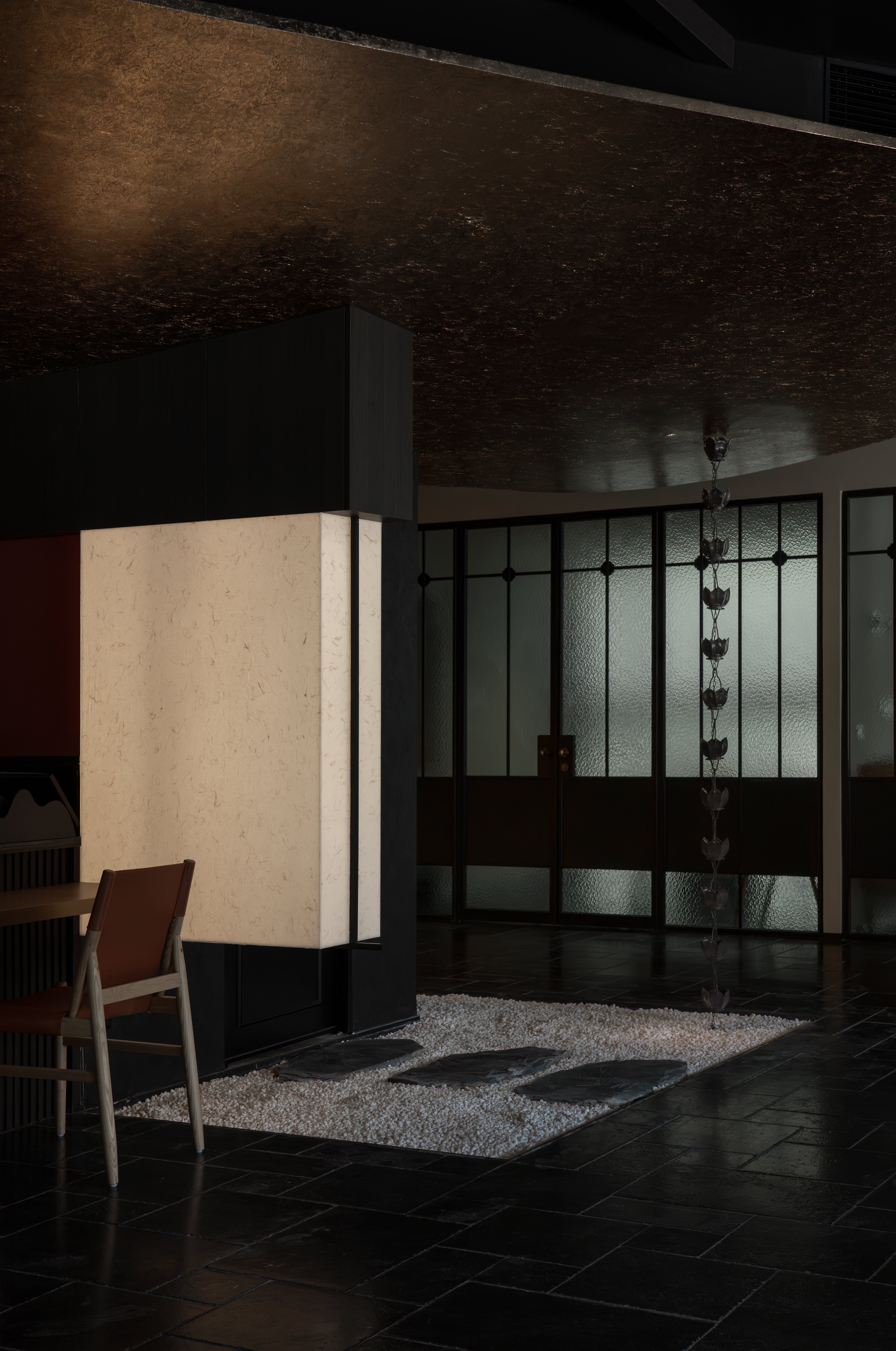 建筑元素中常见的拱形元素被应用于前厅隔断结构中的拱形开窗中,室外盎然的自然景色也被界定为一幅框景。食客在此用餐,更能感受不同于日常生活情境中的仪式感。深色系的地砖、浅色系的墙砖与红色系中台形成材料颜色的对比。随着不同的线条、光影、材质的组合,我们精心“编奏”的空间序幕缓缓展开,公共座位区穿插着设计的纸灯,也为访客带来手工艺的温暖气息。