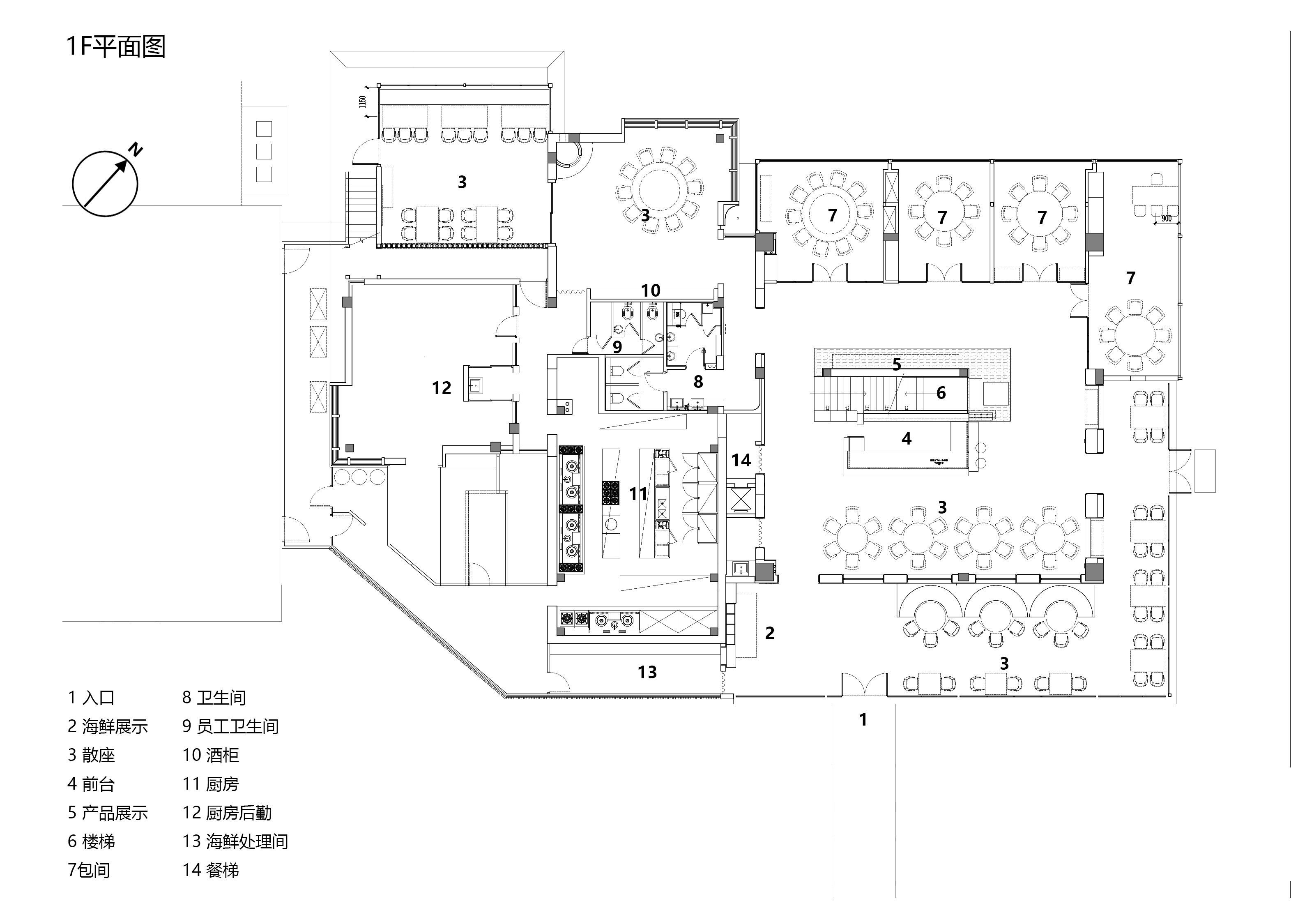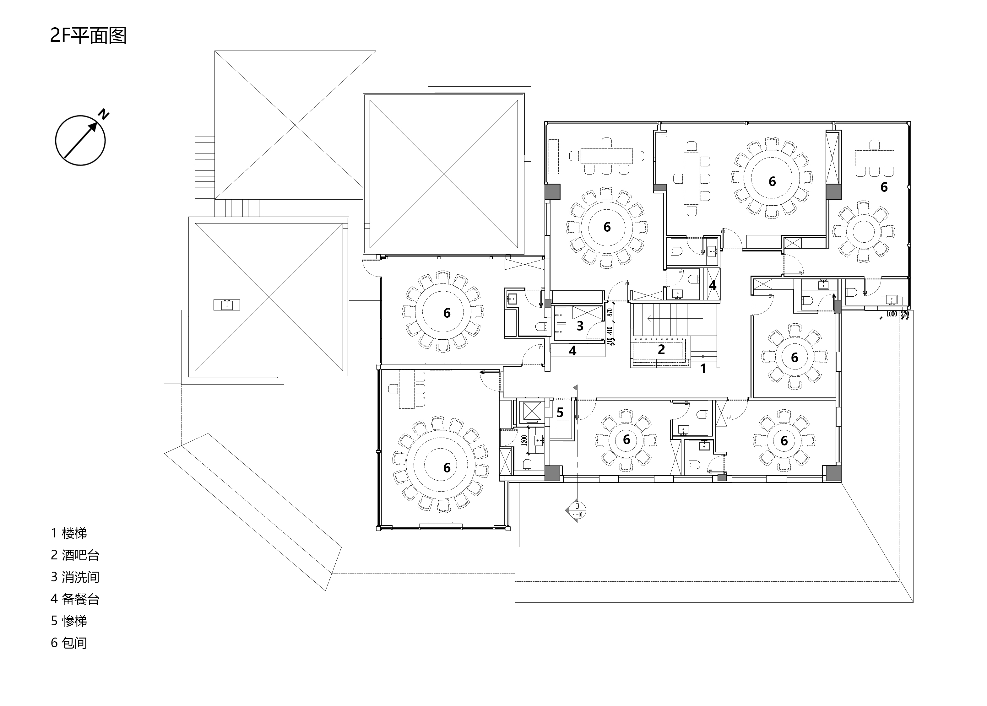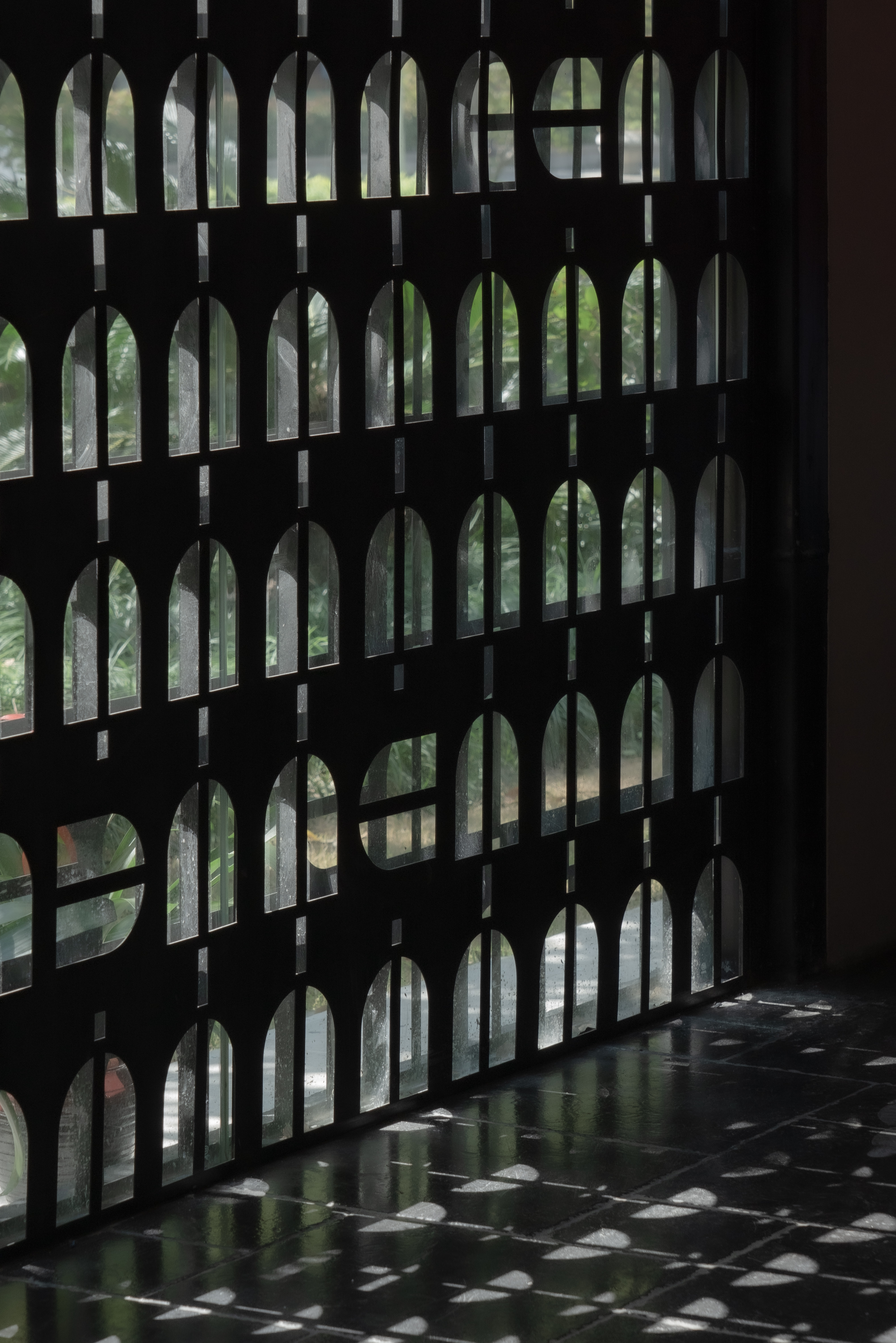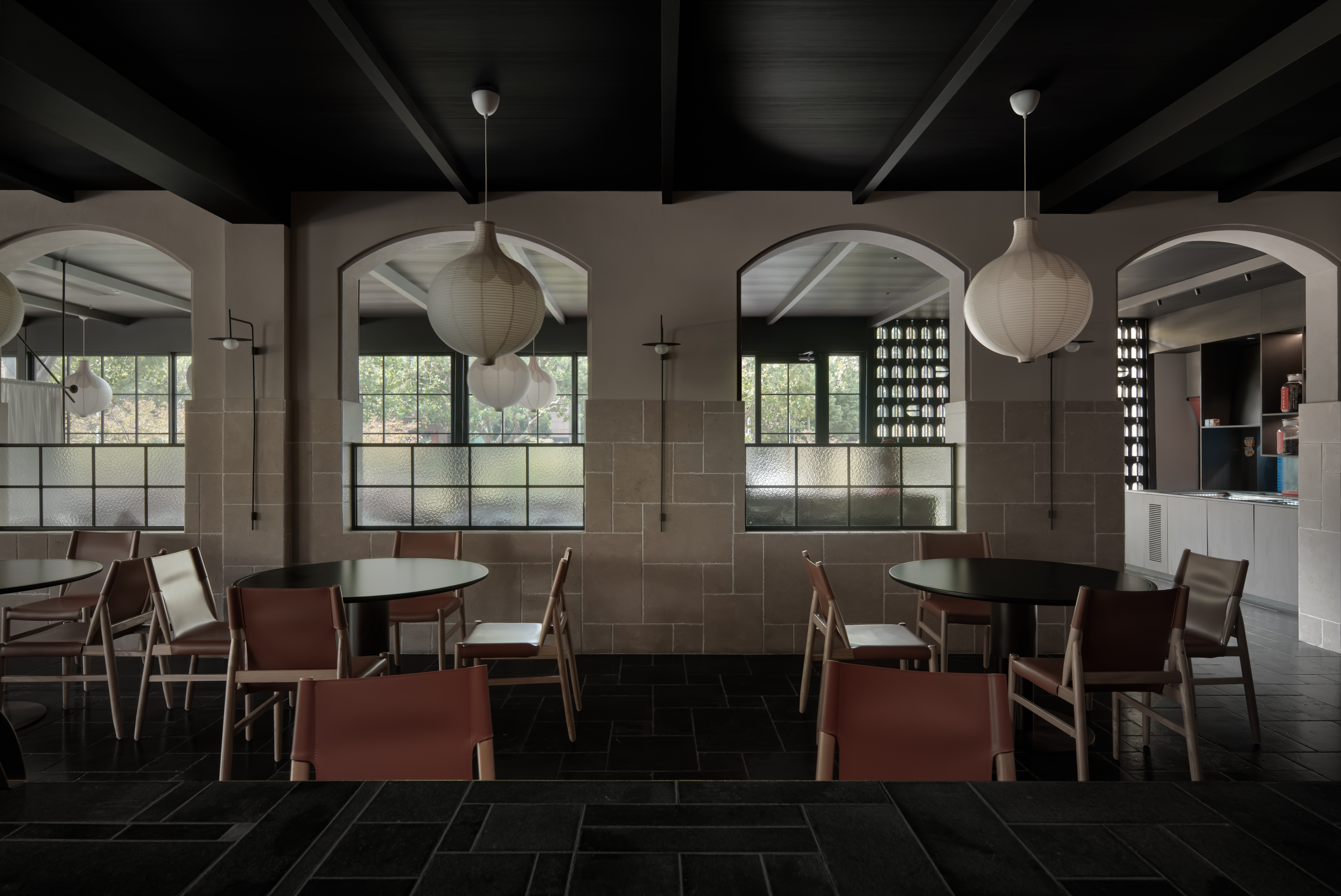 建筑元素中常见的拱形元素被应用于前厅隔断结构中的拱形开窗中,室外盎然的自然景色也被界定为一幅框景。食客在此用餐,更能感受不同于日常生活情境中的仪式感。深色系的地砖、浅色系的墙砖与红色系中台形成材料颜色的对比。随着不同的线条、光影、材质的组合,我们精心“编奏”的空间序幕缓缓展开,公共座位区穿插着设计的纸灯,也为访客带来手工艺的温暖气息。
