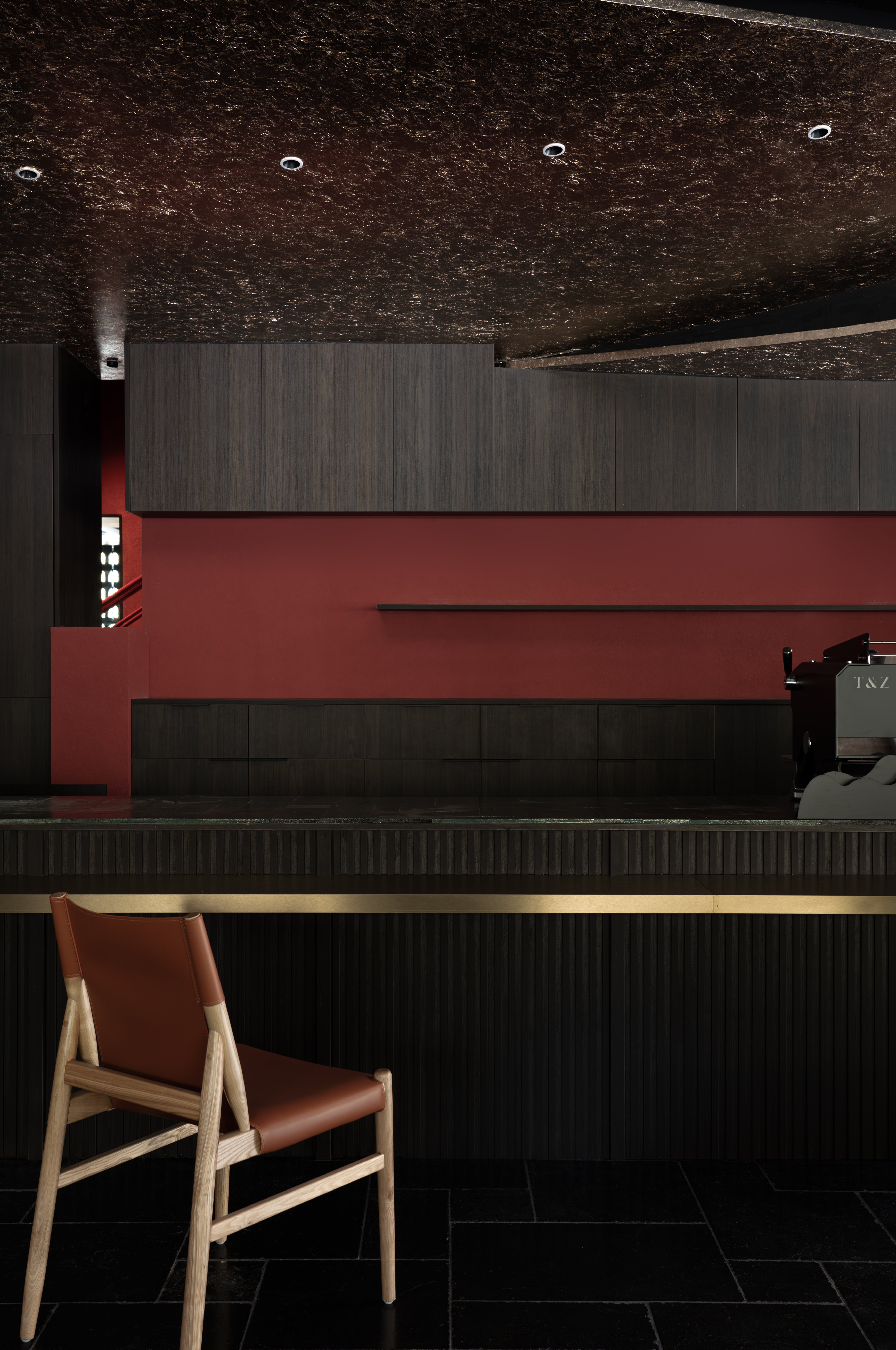 The arch, a common architectural element, is integrated into the arched windows of the front hall partition—through this design, the vibrant outdoor scenery is framed into a deliberate "picture view".Dark-toned floor tiles, light-colored wall tiles, and the red-hued central counter create striking color contrasts between the materials. As different lines, light and shadow, and textures converge, the carefully "orchestrated" opening chapter of the space unfolds gradually.