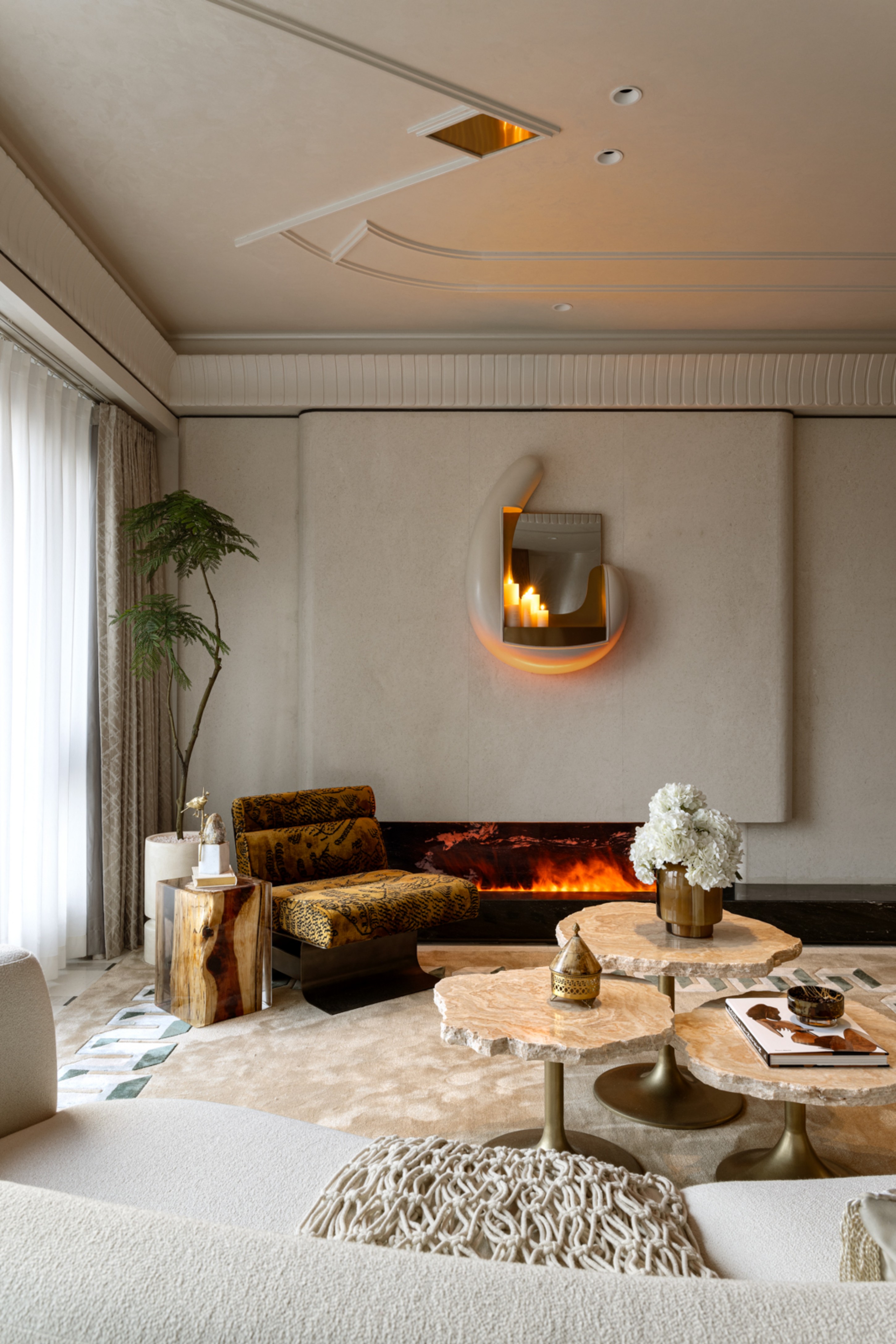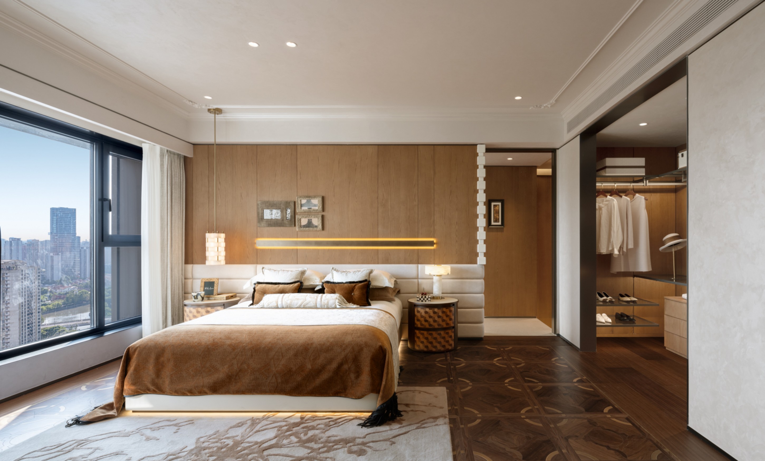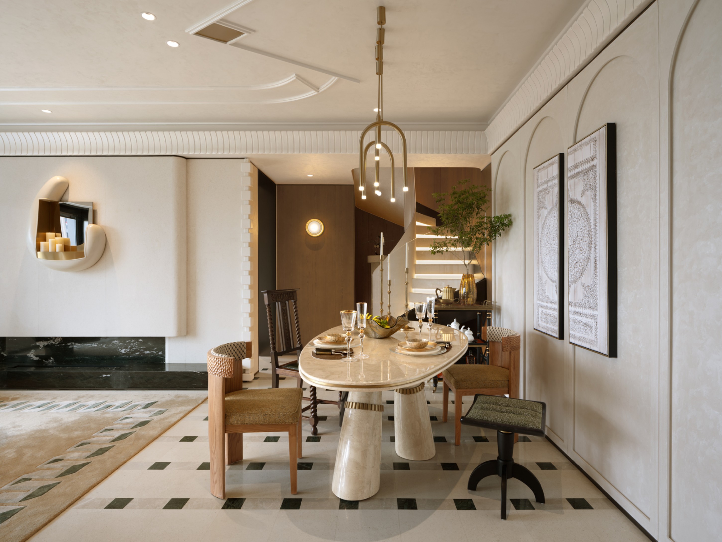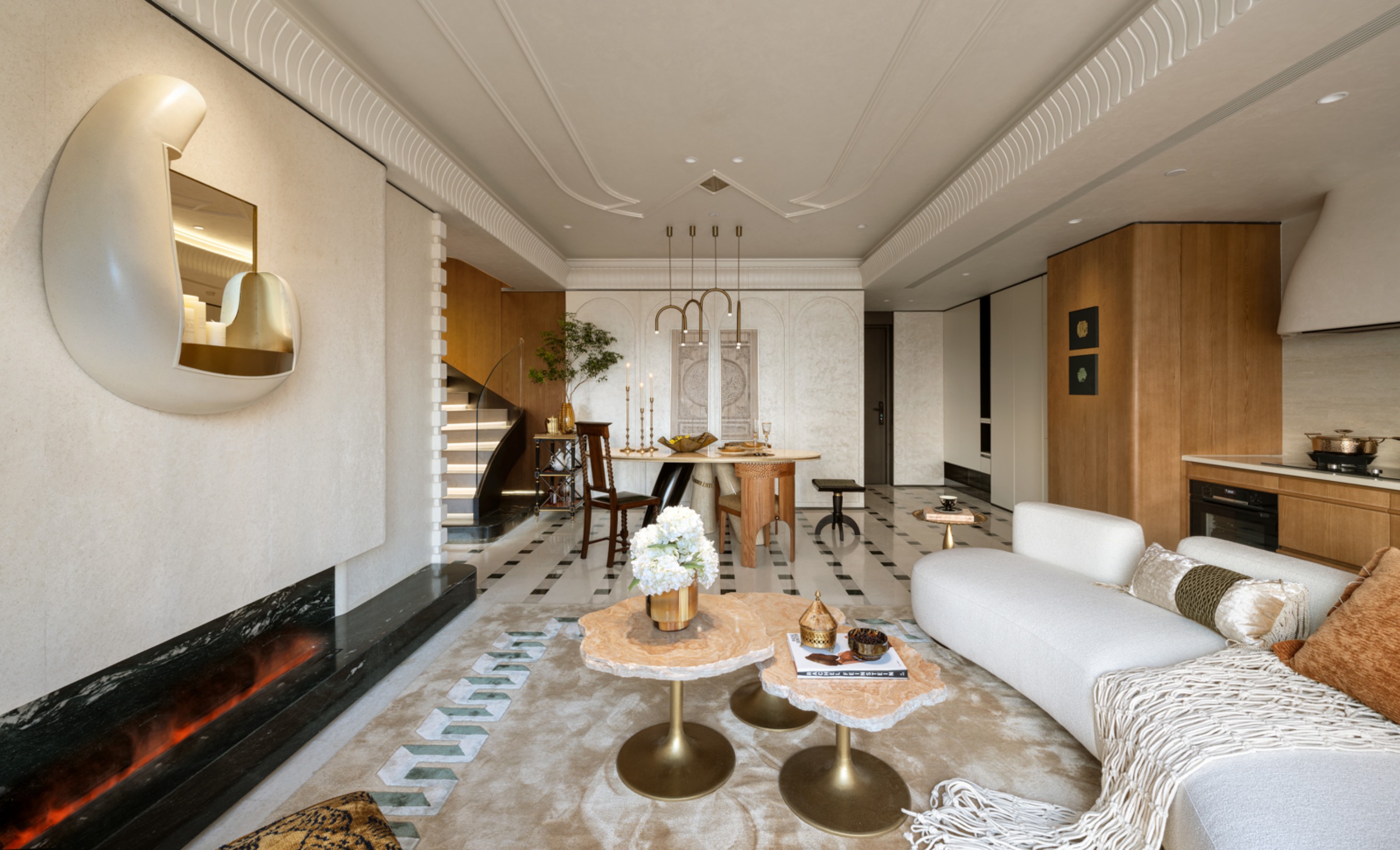本案为196㎡叠层户型,为追求不趋于同的稀缺属性,将其定位:“云端惬意的空中别墅”,用空中别墅的区位价值,别墅之下,平层之上,来实现定位破局。以经典法式复古风格为基调,营造浪漫优雅的生活情境。空间整体以奶油白、浅米色为主色调,搭配棕色木饰面与古铜金属,呈现细腻丰富的层次。一层客餐厅采用LDK贯通一体设计,强化空间感的同时,让室内获得更好的视野和采光,大面落地玻璃窗把苏州河畔的美景尽收眼底。米色石材背景墙在空间形成视觉聚焦,艺术装置和加湿壁炉的配搭更提升空间感染力。复古木色、艺术涂料材质对比在空间中形成和谐视觉节奏,使空间更有温度和质感。二层主卧室设计主旨是平和优雅,轻盈松弛,不用繁杂的装饰,以柔和的色调和极具质感的材料,营造家的温度。床头背景采用木面分割拼接形式与米色皮革软包相结合,形成经典复古的比例构图。通过拼花地板和复古天花线条来呼应出空间的整体风格。