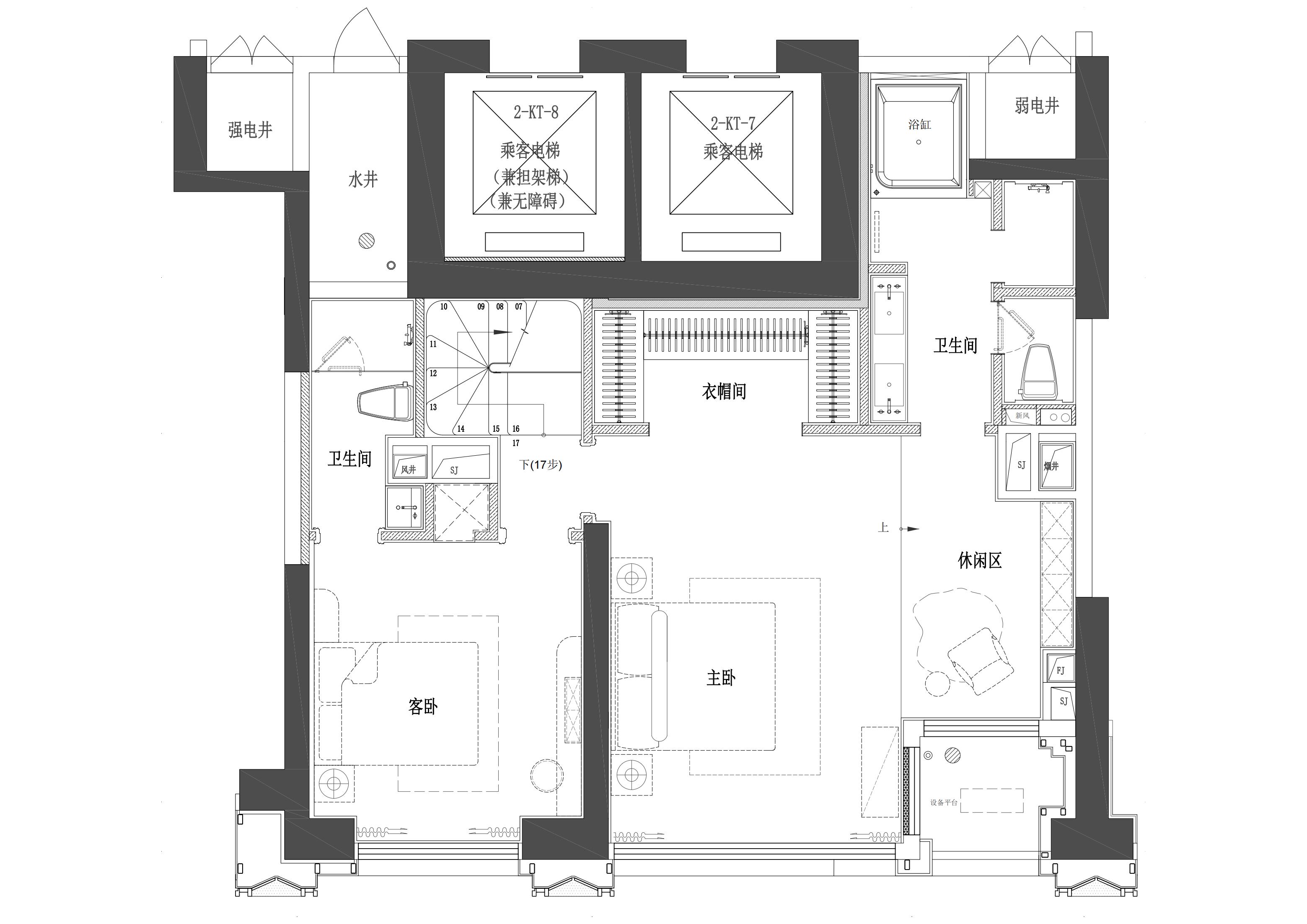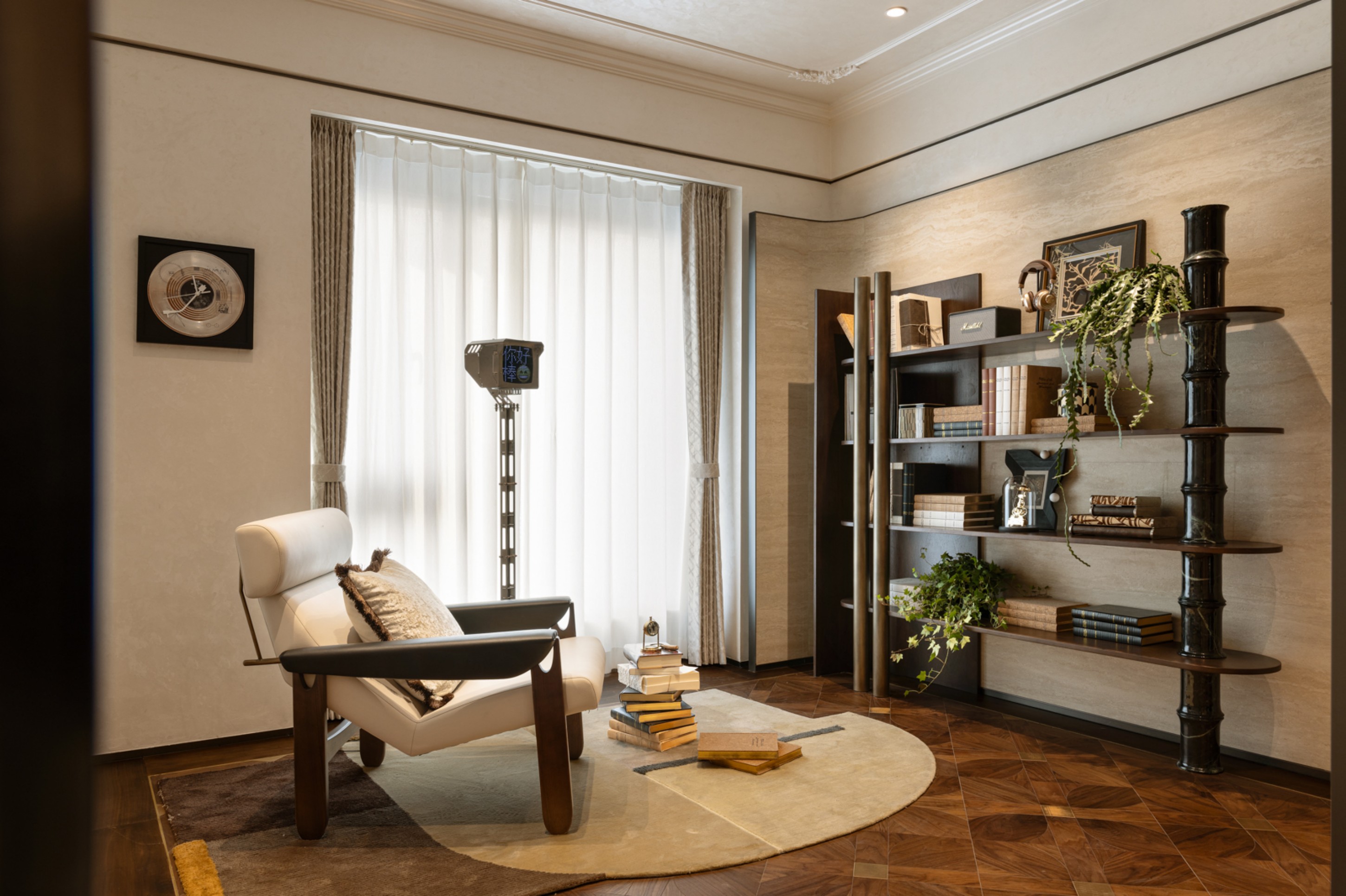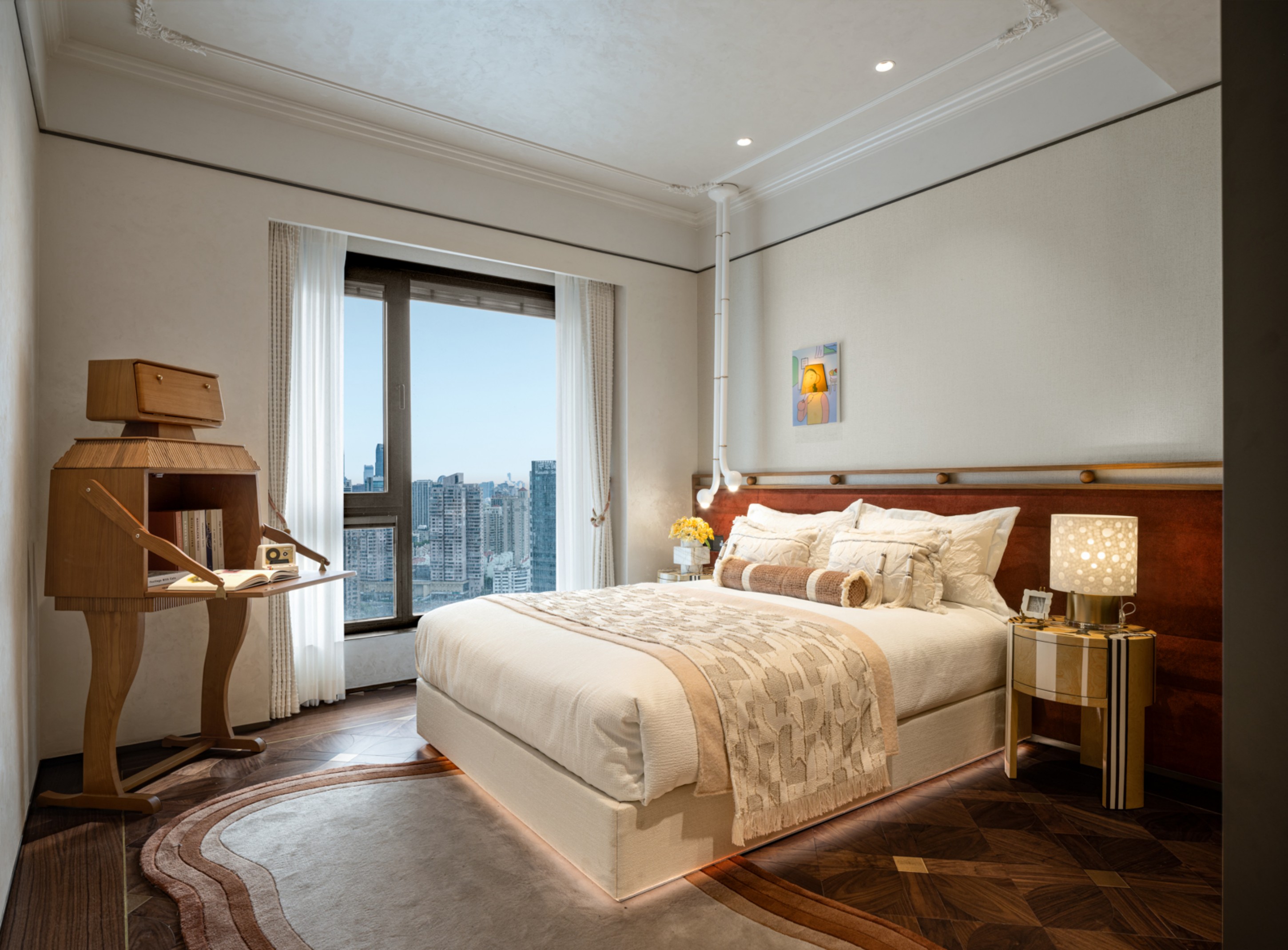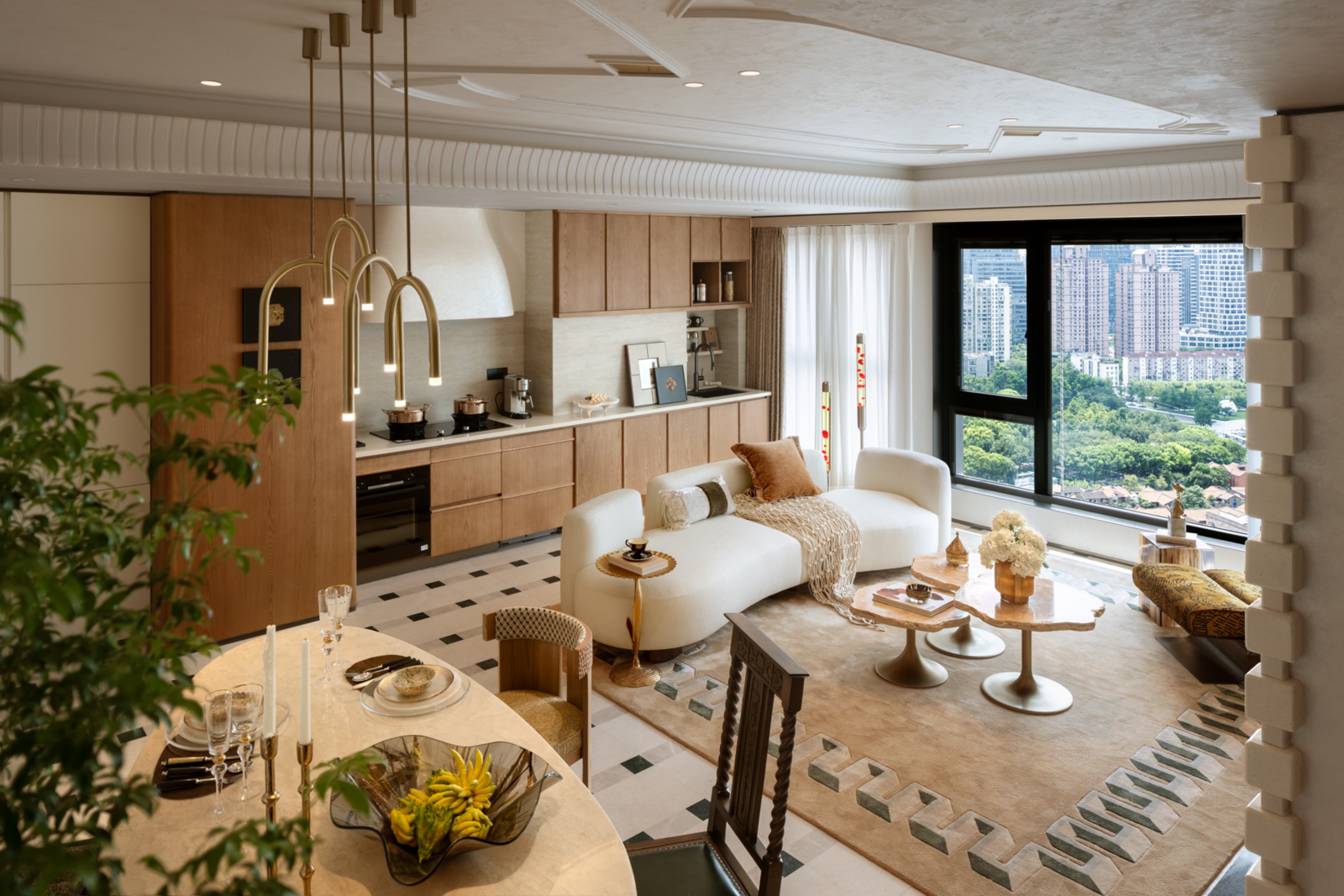 本案为196㎡叠层户型,为追求不趋于同的稀缺属性,将其定位:“云端惬意的空中别墅”,用空中别墅的区位价值,别墅之下,平层之上,来实现定位破局。以经典法式复古风格为基调,营造浪漫优雅的生活情境。空间整体以奶油白、浅米色为主色调,搭配棕色木饰面与古铜金属,呈现细腻丰富的层次。一层客餐厅采用LDK贯通一体设计,强化空间感的同时,让室内获得更好的视野和采光,大面落地玻璃窗把苏州河畔的美景尽收眼底。米色石材背景墙在空间形成视觉聚焦,艺术装置和加湿壁炉的配搭更提升空间感染力。复古木色、艺术涂料材质对比在空间中形成和谐视觉节奏,使空间更有温度和质感。二层主卧室设计主旨是平和优雅,轻盈松弛,不用繁杂的装饰,以柔和的色调和极具质感的材料,营造家的温度。床头背景采用木面分割拼接形式与米色皮革软包相结合,形成经典复古的比例构图。通过拼花地板和复古天花线条来呼应出空间的整体风格。