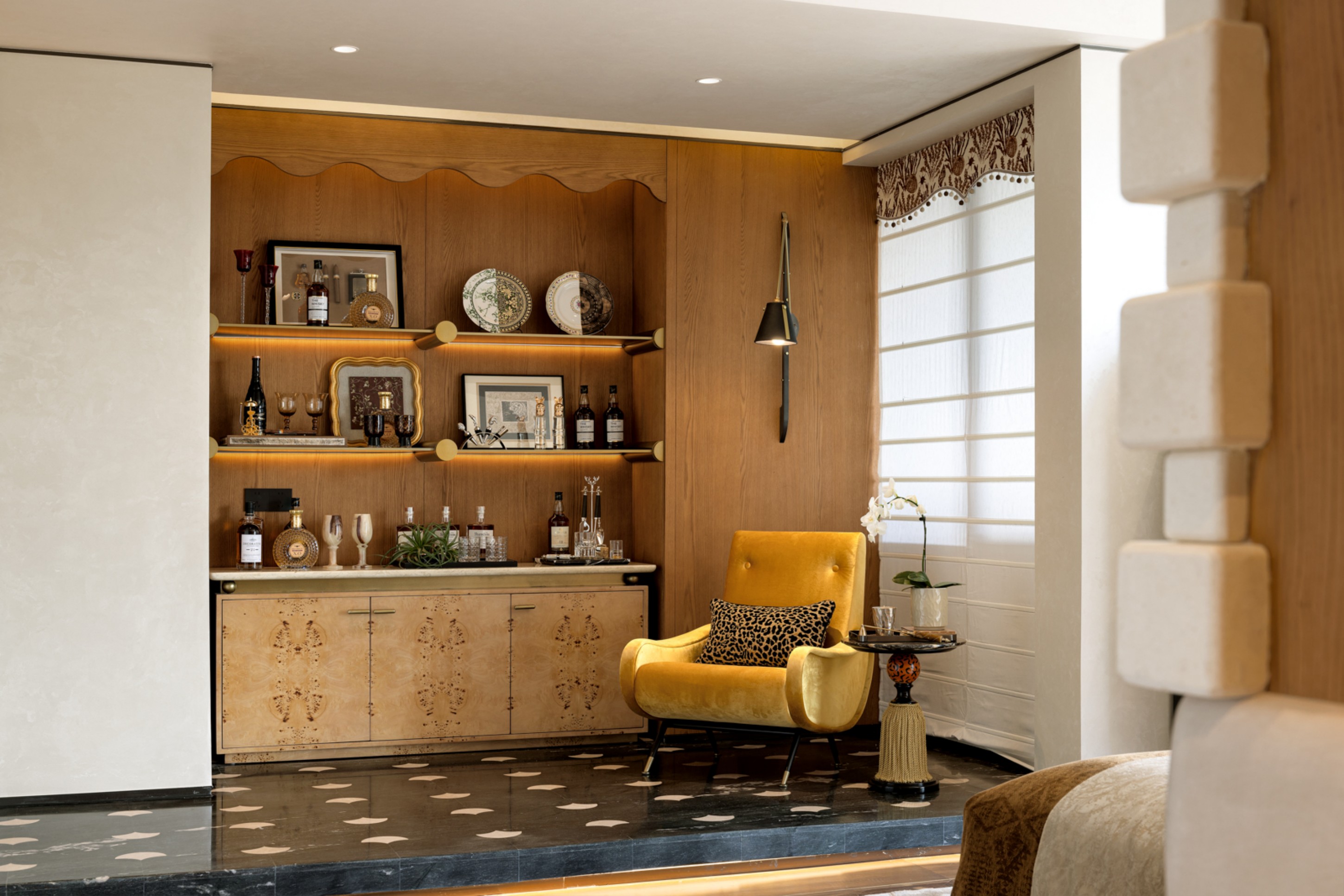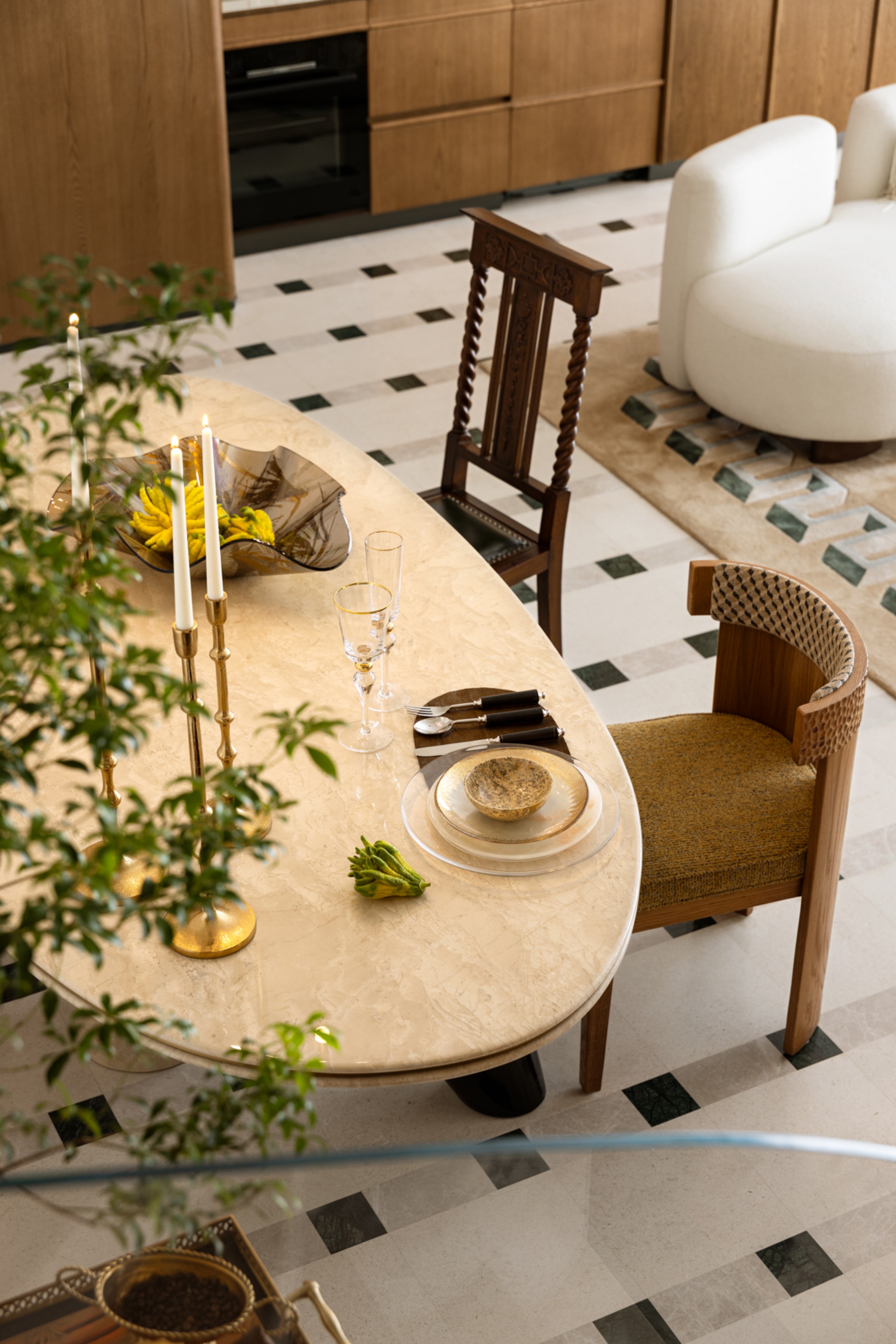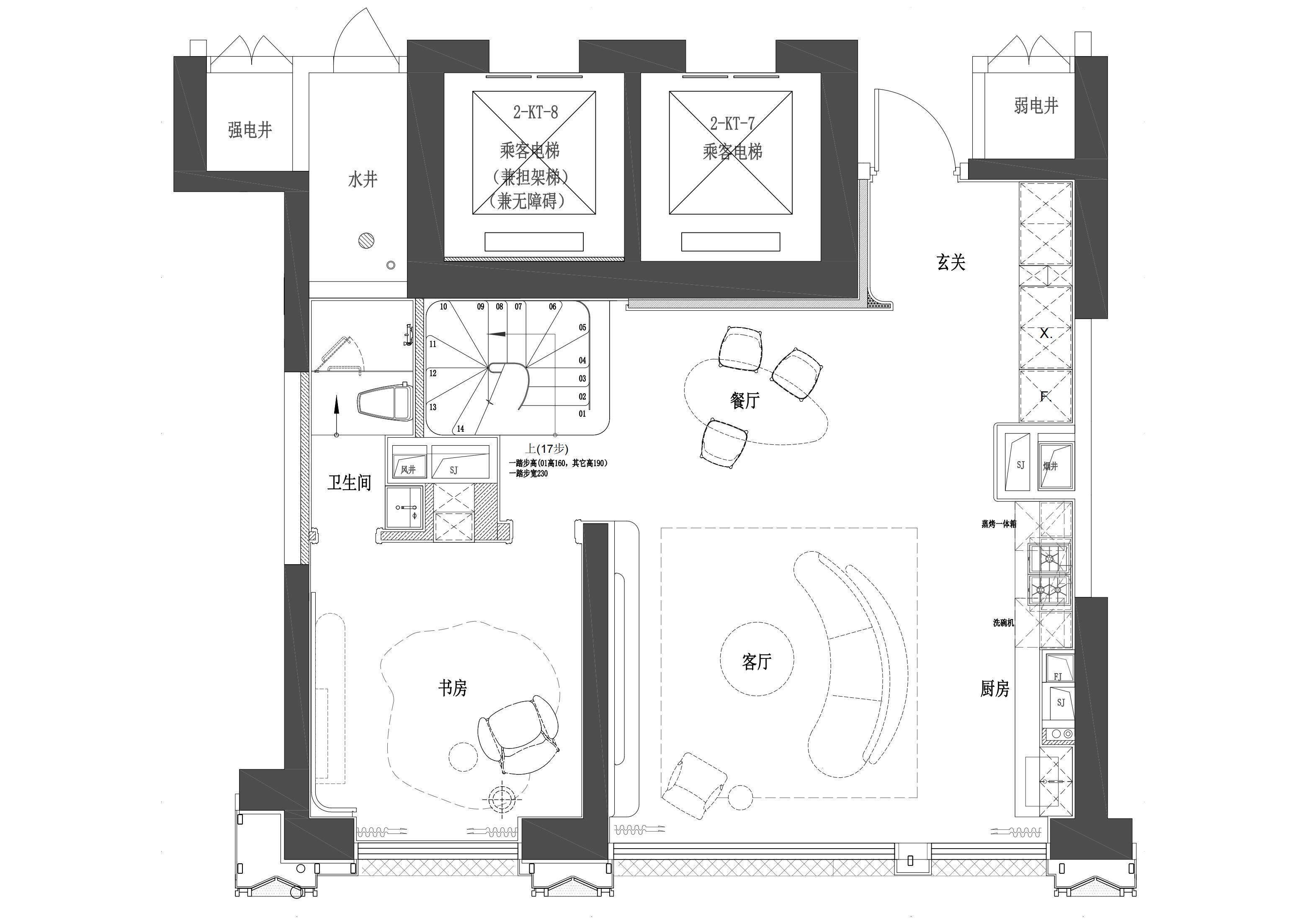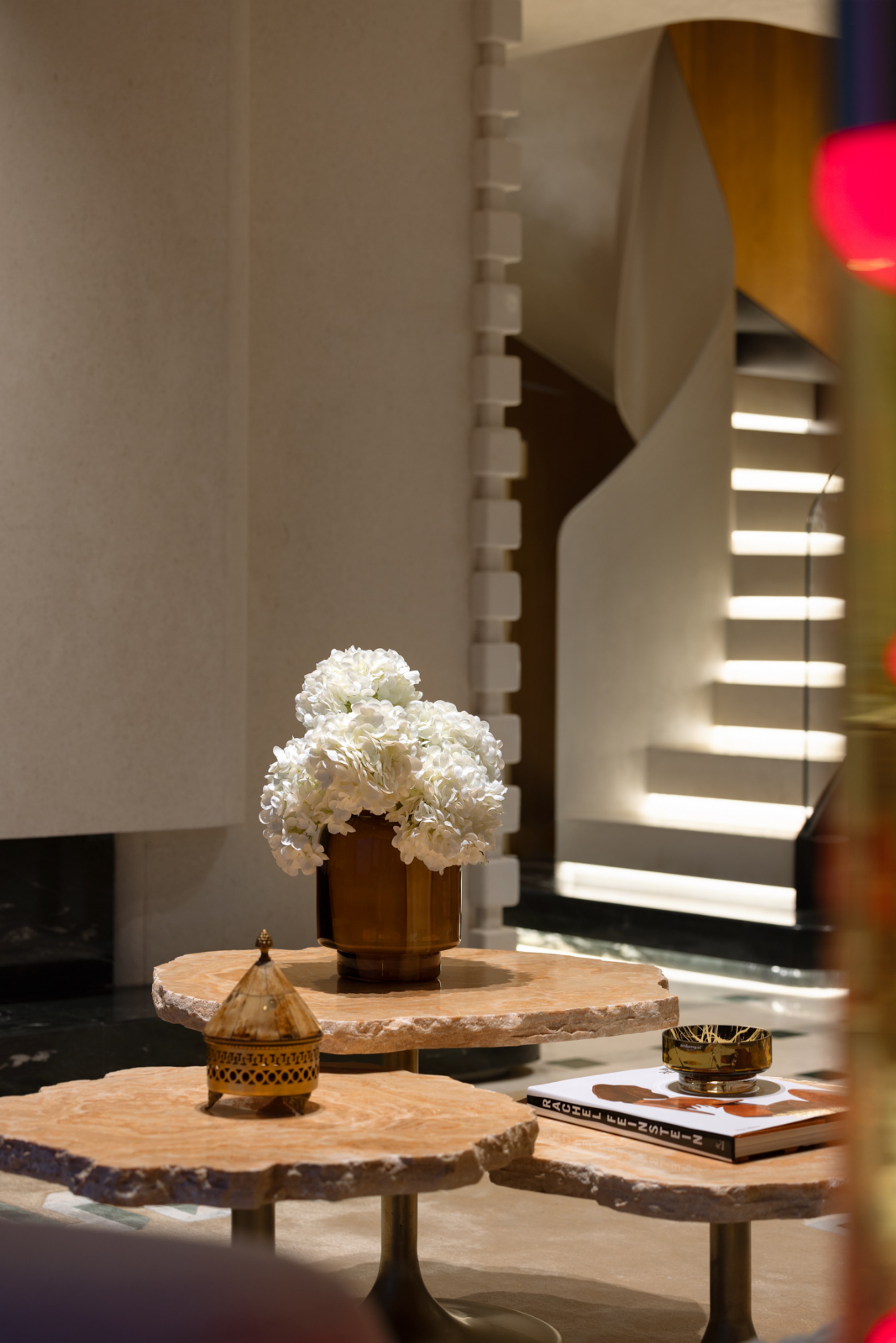 本案为196㎡叠层户型,为追求不趋于同的稀缺属性,将其定位:“云端惬意的空中别墅”,用空中别墅的区位价值,别墅之下,平层之上,来实现定位破局。以经典法式复古风格为基调,营造浪漫优雅的生活情境。空间整体以奶油白、浅米色为主色调,搭配棕色木饰面与古铜金属,呈现细腻丰富的层次。一层客餐厅采用LDK贯通一体设计,强化空间感的同时,让室内获得更好的视野和采光,大面落地玻璃窗把苏州河畔的美景尽收眼底。米色石材背景墙在空间形成视觉聚焦,艺术装置和加湿壁炉的配搭更提升空间感染力。复古木色、艺术涂料材质对比在空间中形成和谐视觉节奏,使空间更有温度和质感。二层主卧室设计主旨是平和优雅,轻盈松弛,不用繁杂的装饰,以柔和的色调和极具质感的材料,营造家的温度。床头背景采用木面分割拼接形式与米色皮革软包相结合,形成经典复古的比例构图。通过拼花地板和复古天花线条来呼应出空间的整体风格。
