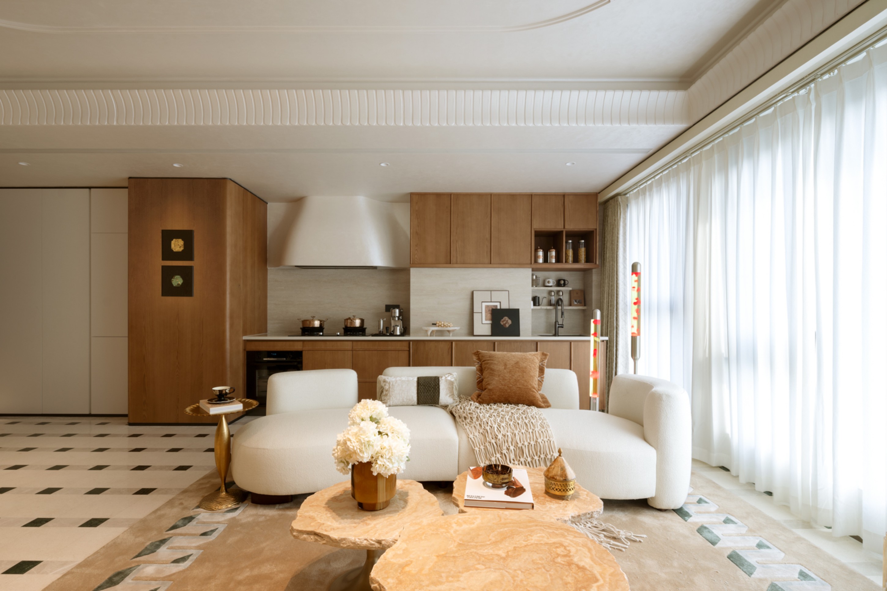 This case is a 196 square meter stacked apartment, positioned as a "comfortable aerial villa in the cloud" in pursuit of different scarce attributes. By utilizing the location value of aerial villas, the positioning is broken through by placing them below the villa and above the ground floor. Based on the classic French retro style, create a romantic and elegant living atmosphere. The overall color scheme of the space is cream white and light beige, complemented by brown wood veneer and antique bronze metal, presenting a delicate and rich layering. The first floor dining room adopts LDK integrated design, which enhances the sense of space while providing better views and lighting indoors. The large floor to ceiling glass windows offer a pan